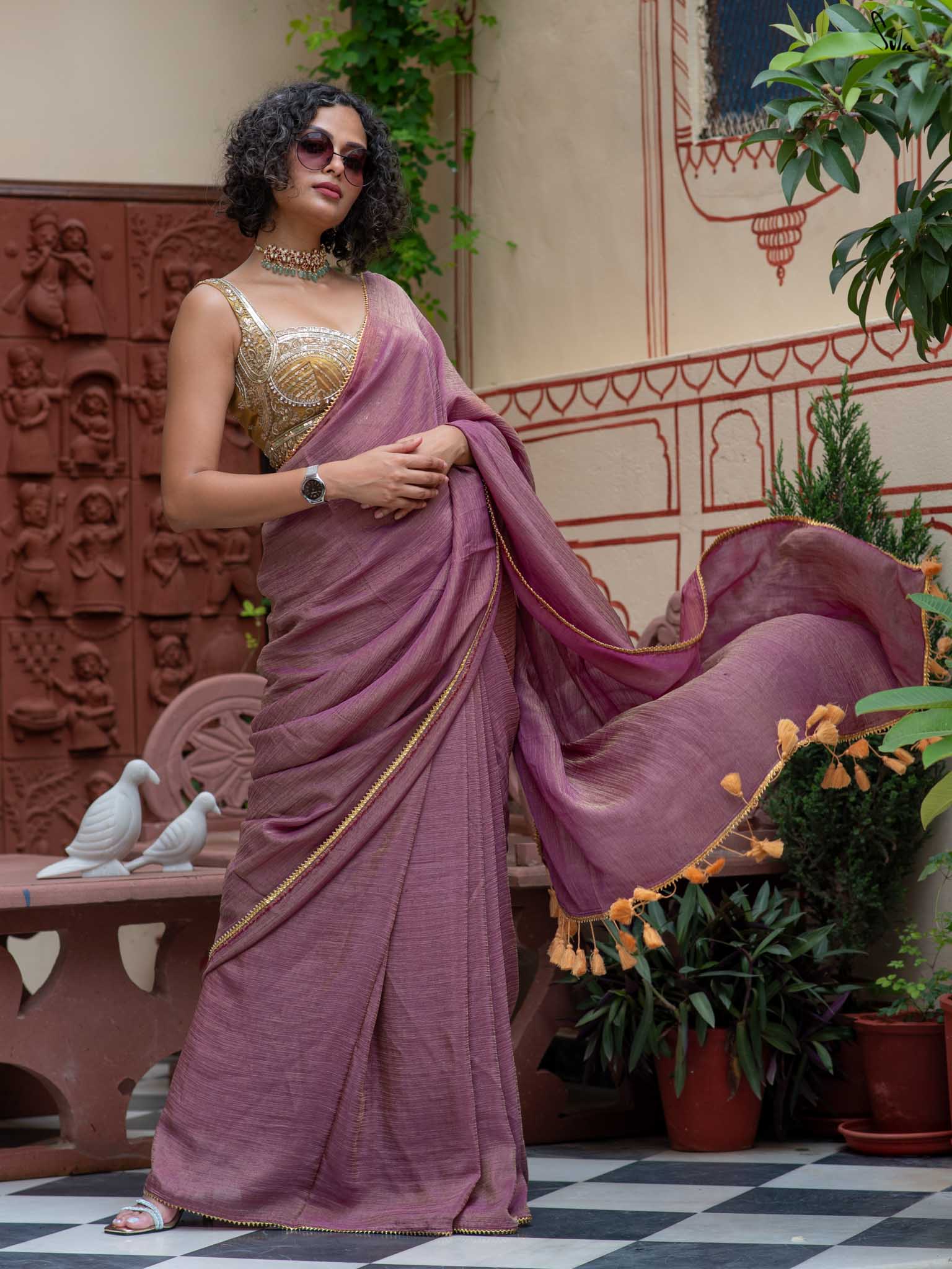 A glass of bold poured into the fabric. This wine crushed viscose saree is rich, moody, and unapologetically dramatic. Contrast tassels and a streak of gota at the border add that intoxicating flash of glam.