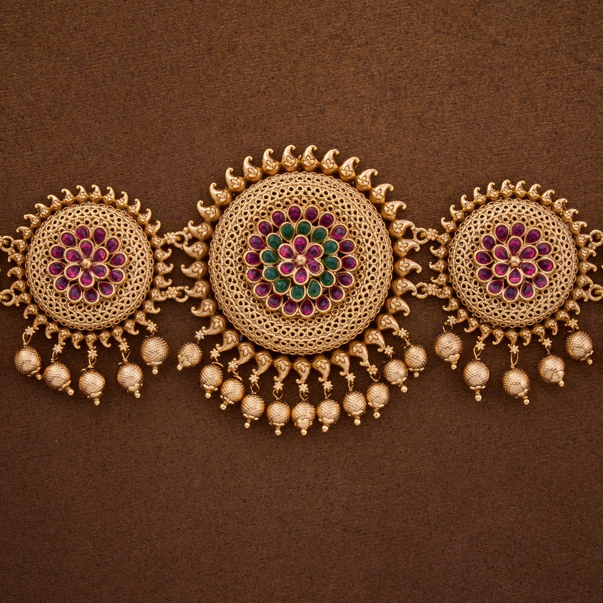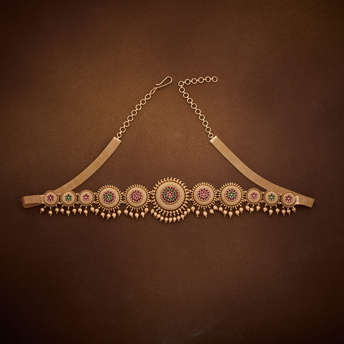 If you are looking for a belt to match the elegance of your ethnic outfits, take a look at our latest antique belt with gold polish on the green and ruby stones. The eye-catching work details on this belt allow it to blend with all outfits and occasions. Grab yours now.