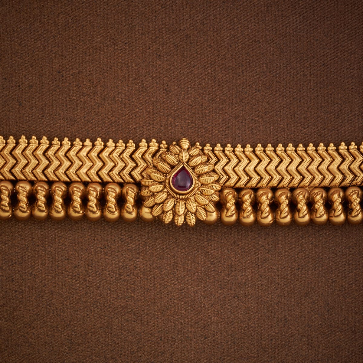 Looking for that perfect accessory to enhance your outfit? Look no further! Our antique belt is the perfect piece for you! The belt boasts a copper alloy base metal, expertly embellished with a radiant ruby-coloured synthetic stone. Whether traditional attire or a modern ensemble, this beautifully designed belt is versatile and never fails to make a statement.