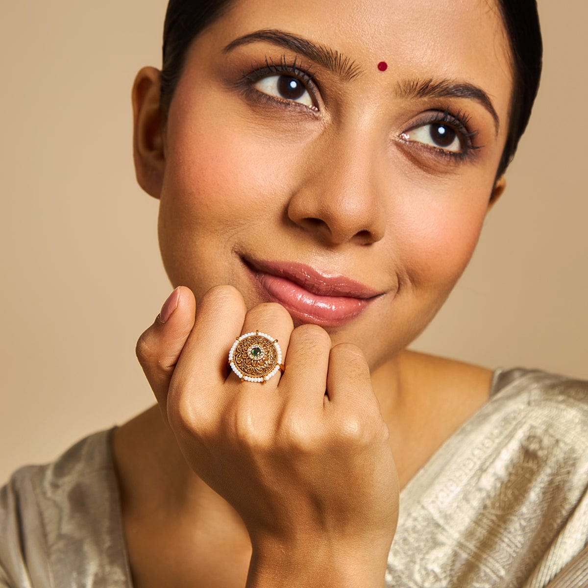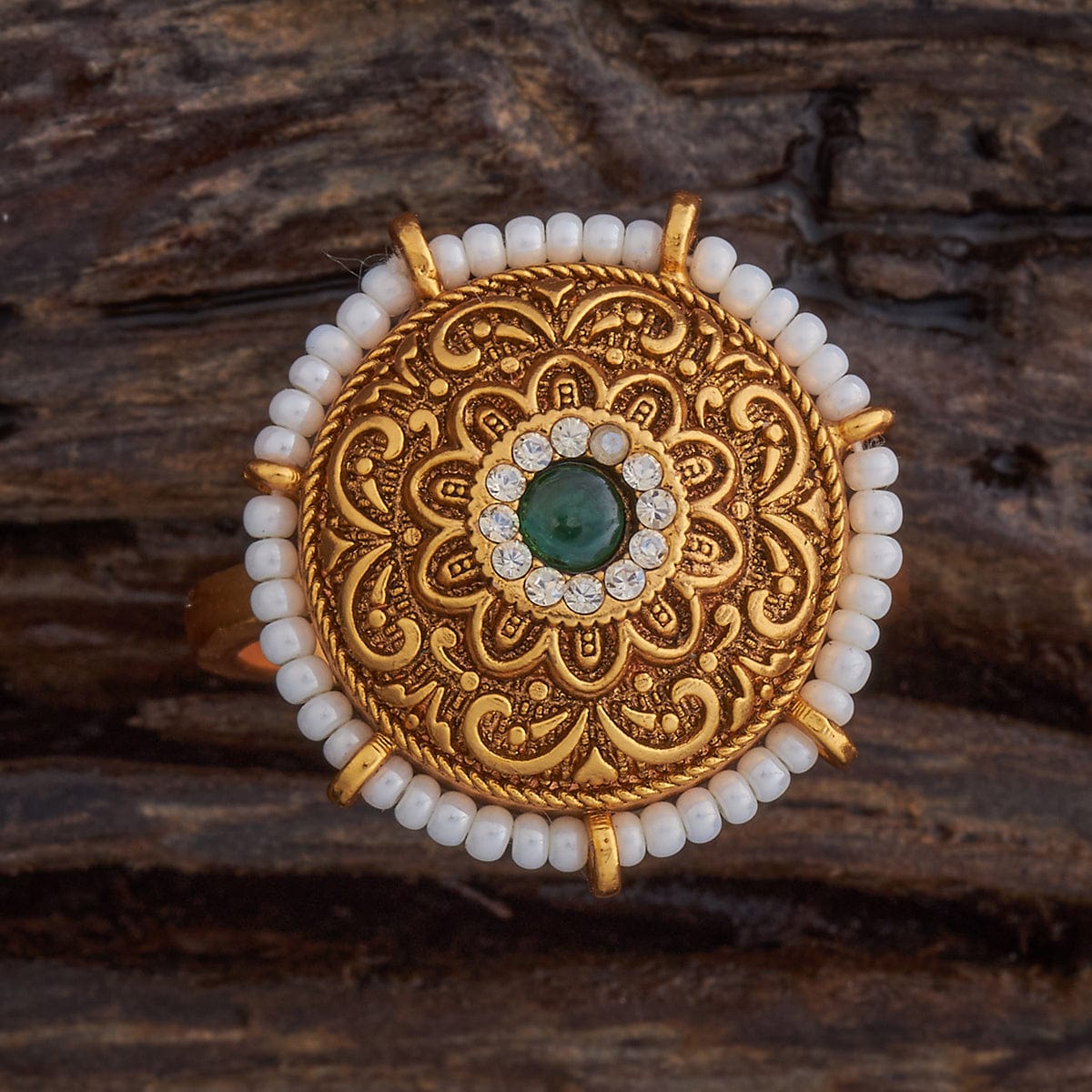 Elevate your ensemble with this antique finger ring, crafted from copper alloy with a golden polish, featuring a stunning design highlighted by green or ruby stones. Adorned with zircon stones and beads, its intricate details make it a standout piece. Adjustable for a perfect fit, it�s an elegant addition to any jewellery collection.