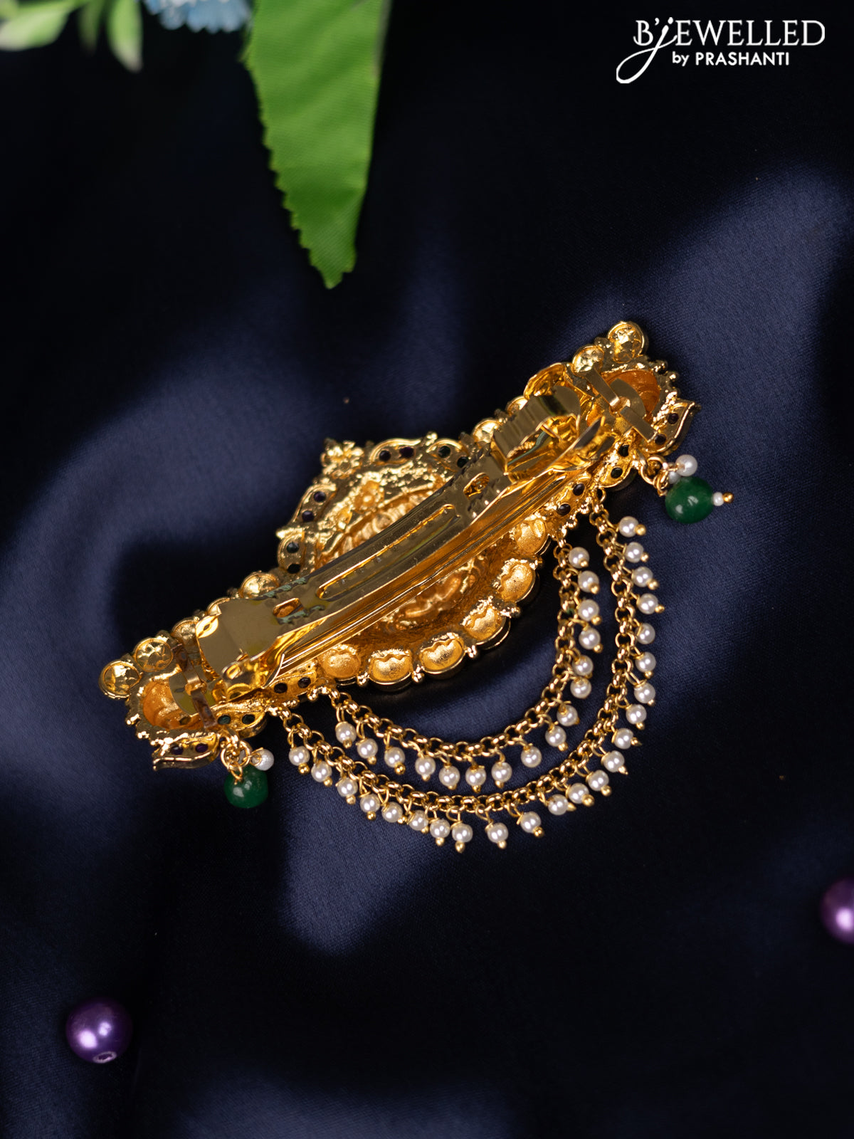 Antique hair clip medium size lakshmi design with kemp & kundan stones and pearl & beads hanging