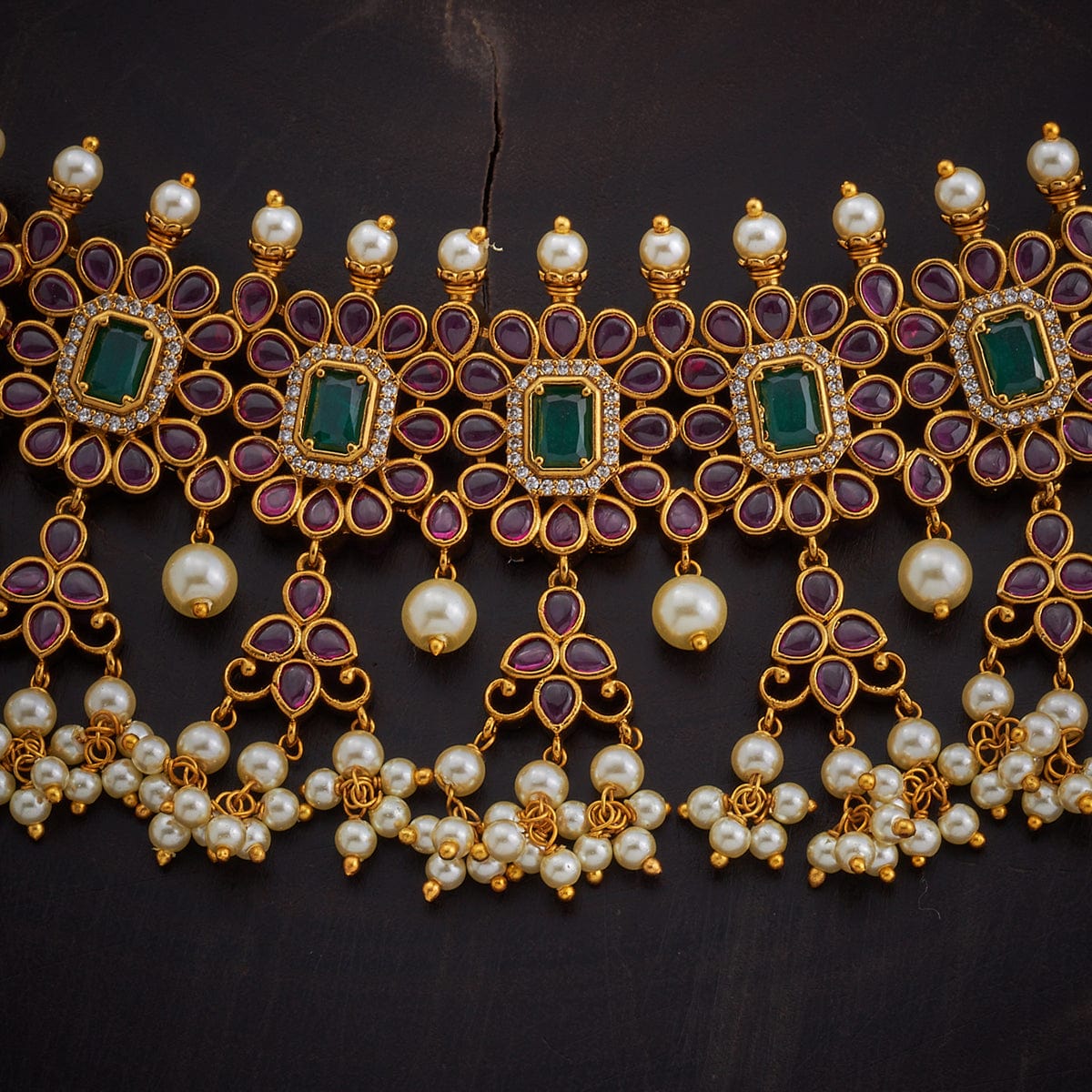 An antique necklace is everything you could desire during festivities. This necklace with ruby-green coloured stones and gold polish is truly one-of-a-kind. The short necklace supports an adjustable chain. It comes with hanging earrings. Pair it with a kurta set and kolhapuris for a complete look.