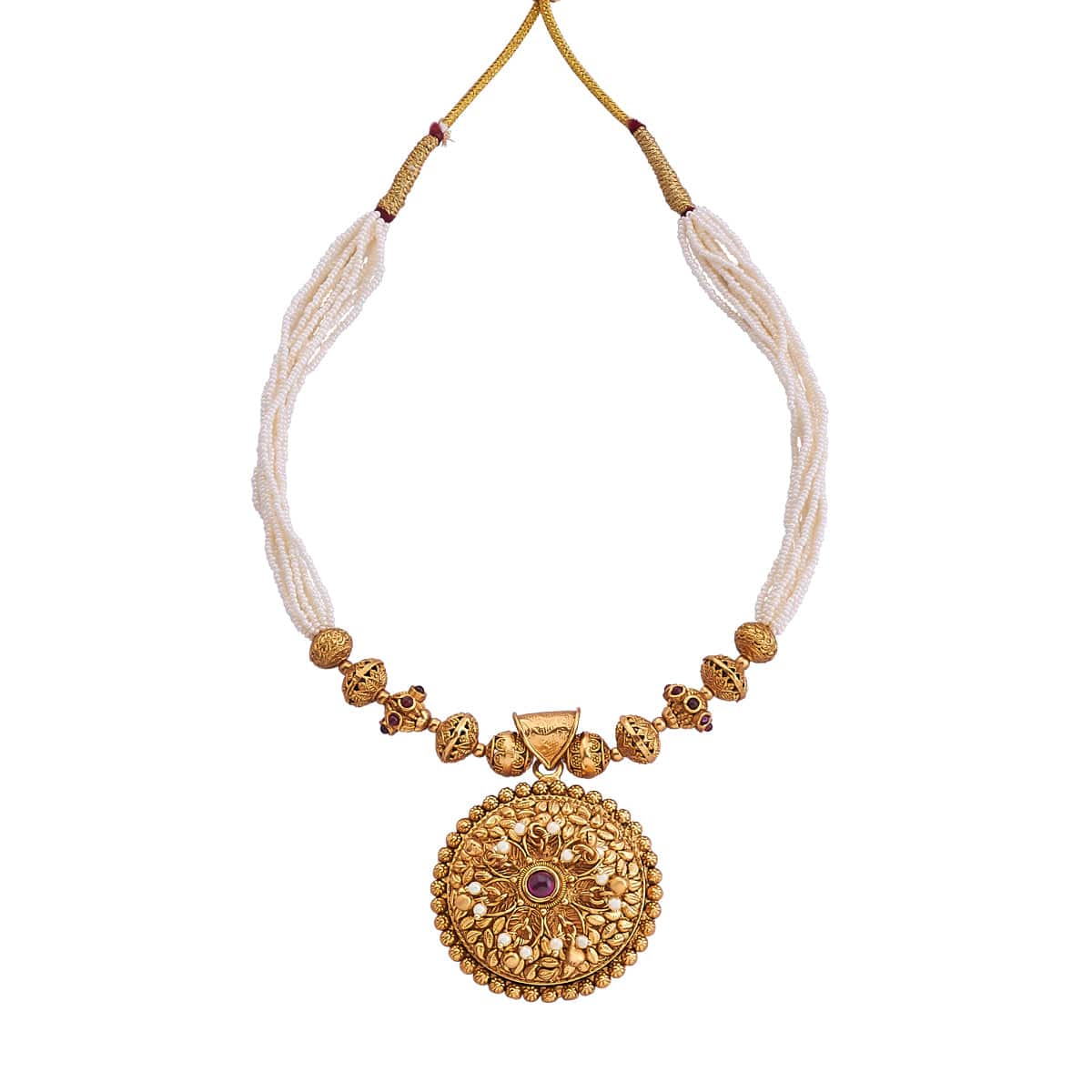 Give your jewellery collection a unique start with our exquisite Antique Necklace! This captivating piece features a gorgeous blend of synthetic stones and a stunning gold polish, exuding a sparkling and heavy look. Each layer of white beads beautifully crafted in multiple layers creates a truly mesmerizing effect. Adorned with a captivating big flowery pendant, this necklace is designed to make a statement.