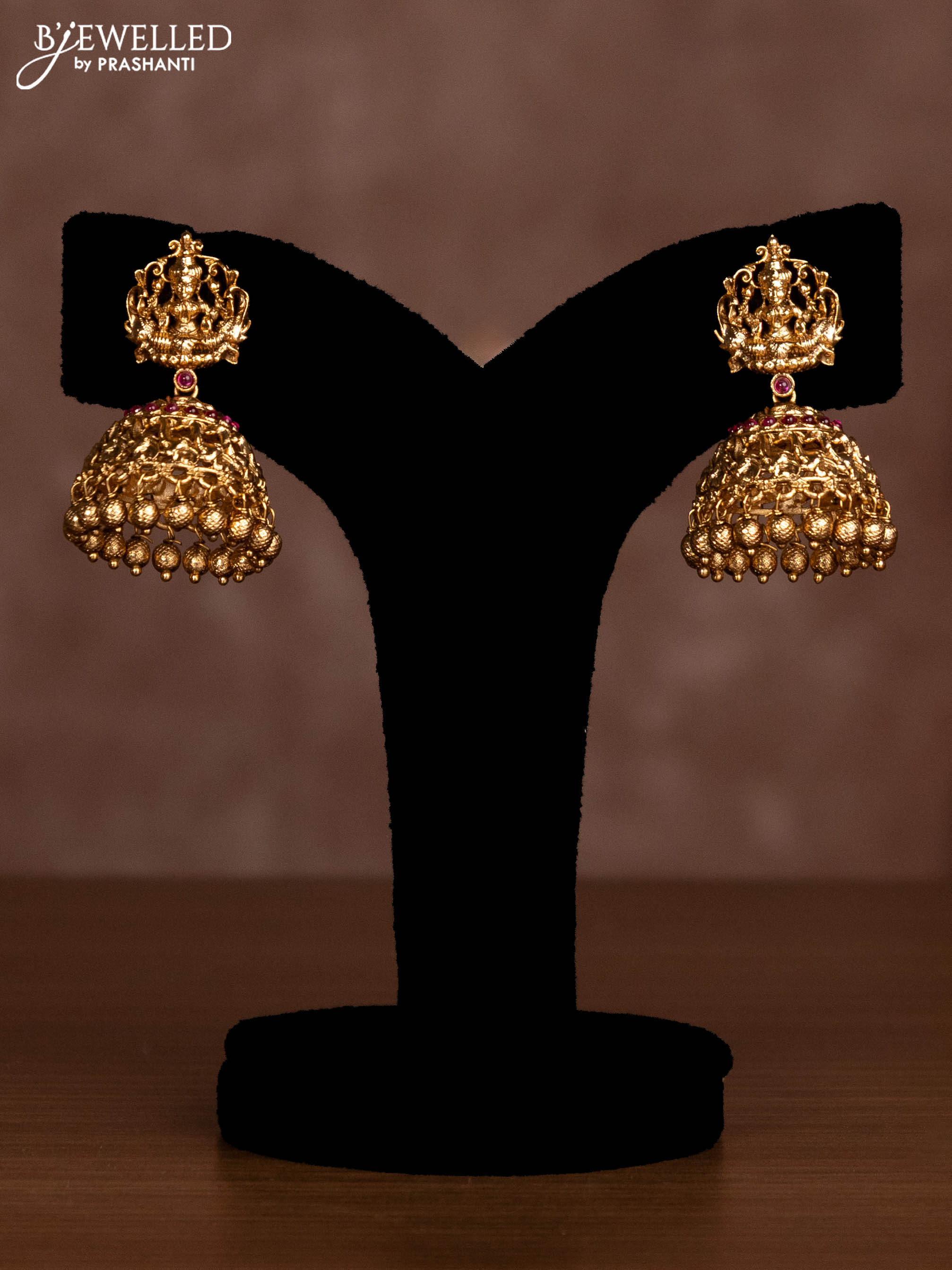 Antique necklace lakshmi design with pink jadau stones and golden beads hanging