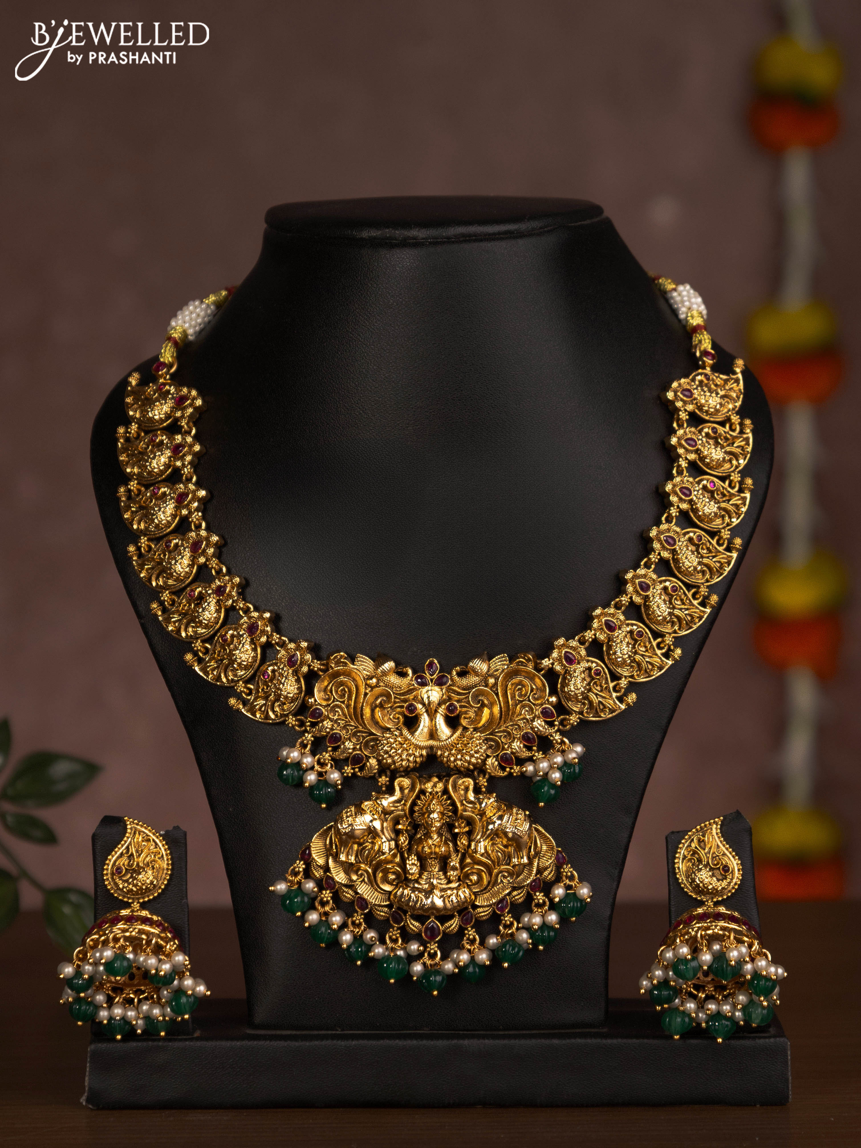 Antique necklace lakshmi design with pink kemp stones and green beads hanging