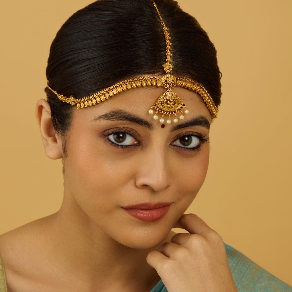 Upgrade your traditional look with this unique antique tikka from Kushal's Antique Jewellery Collection, a beautiful piece crafted from copper alloy and adorned with vibrant ruby-coloured synthetic stones and beads. The tikka is lightweight and finished in a classic gold polish for a timeless appeal.