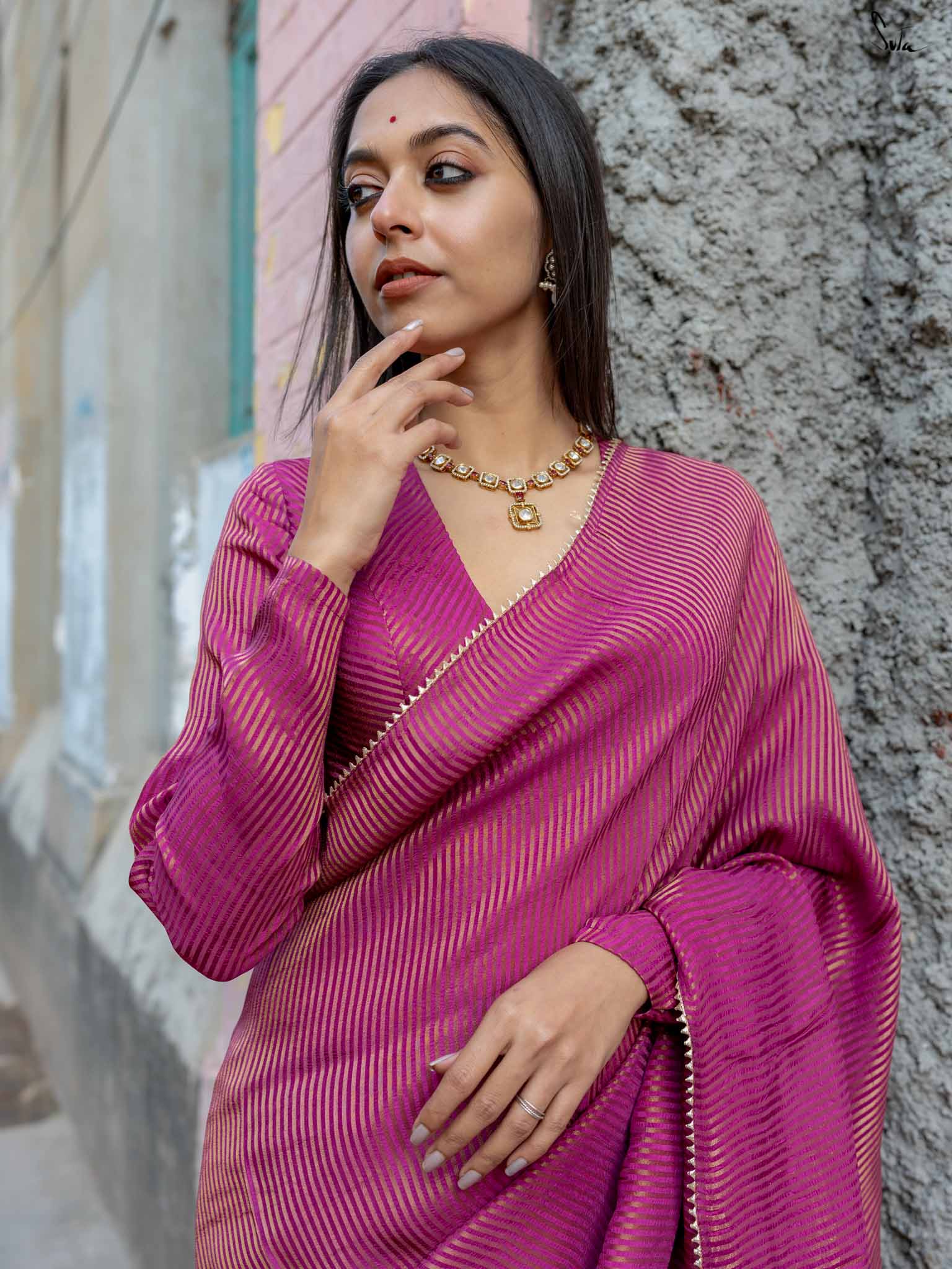 A rich burgundy blouse with V-neckline and woven zari stripes. crafted from breathable viscose zari, it features full sleeves and a front hook opening, perfect for any event.