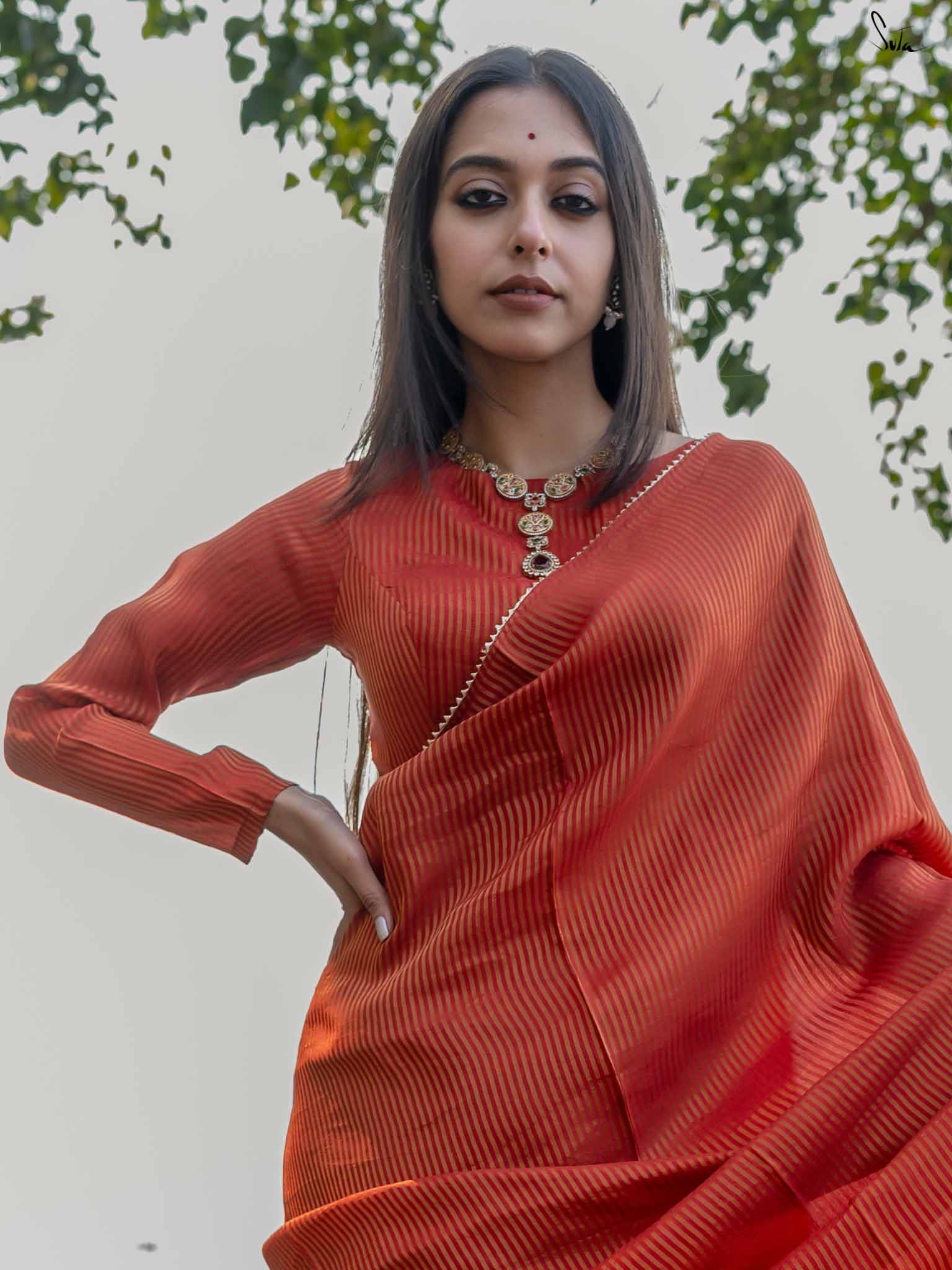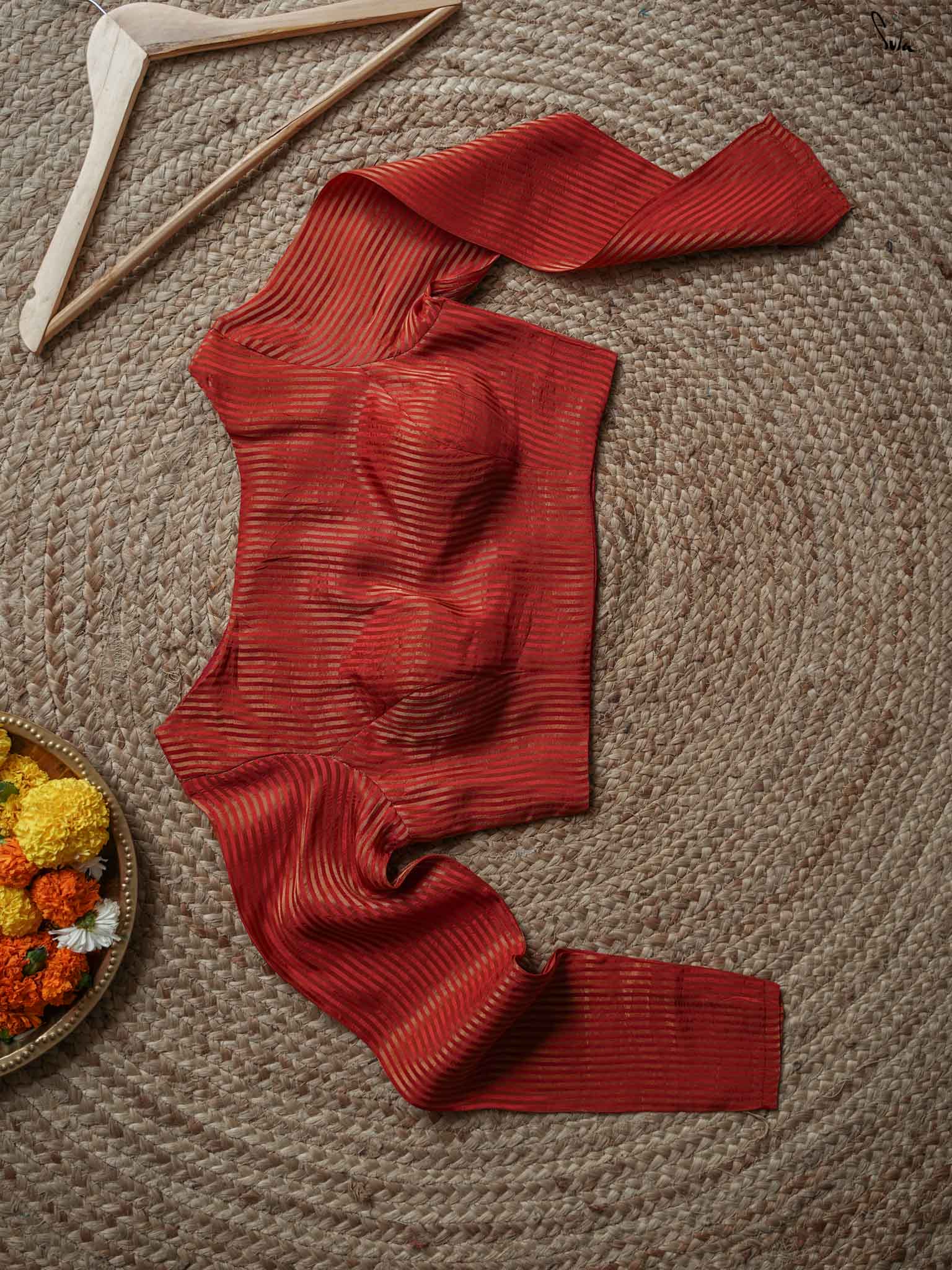 A radiant red blouse crafted from viscose zari with zari stripes. The boat-neck style and full sleeves offer comfort, with a front hook opening for easy wear.