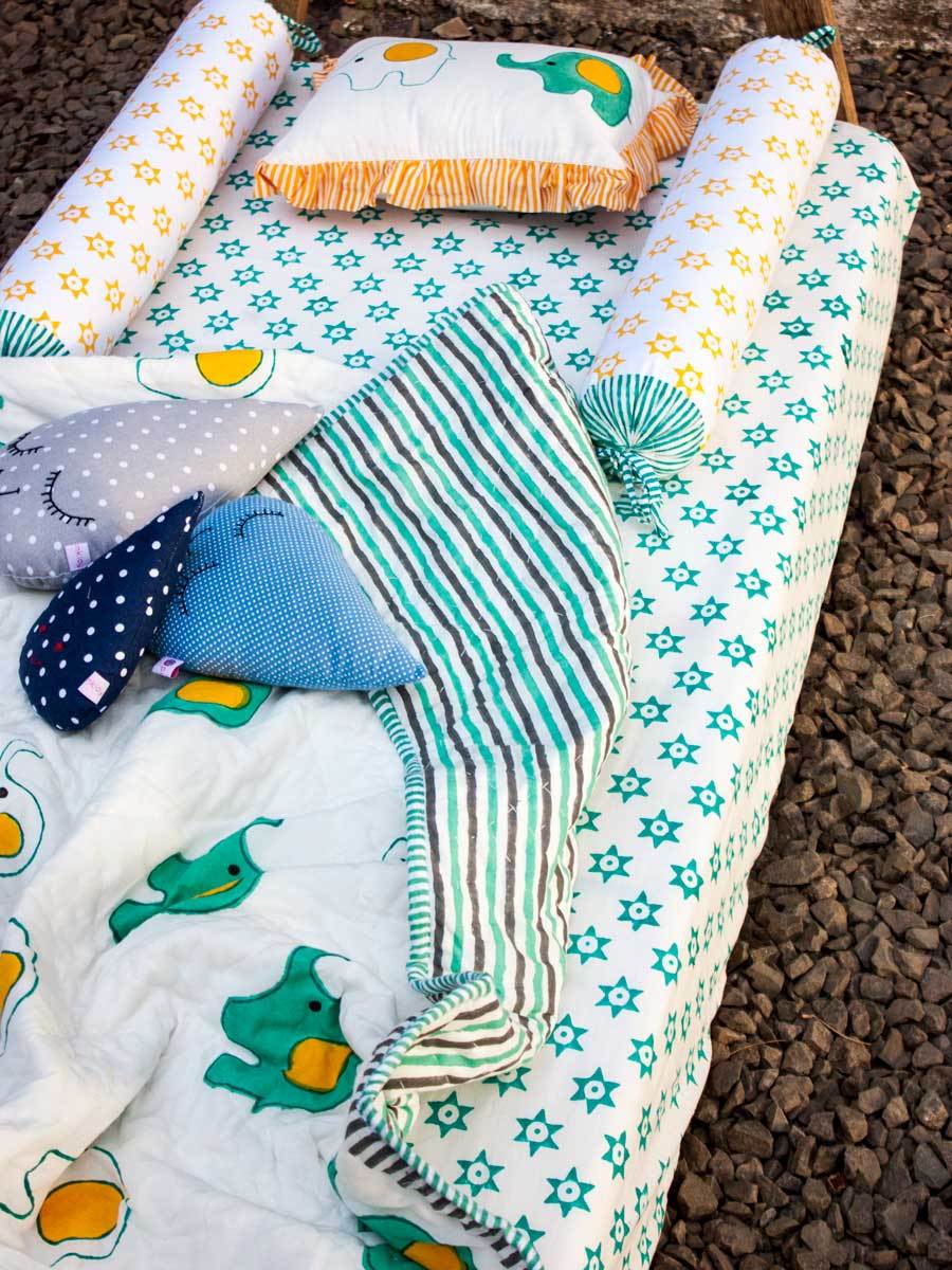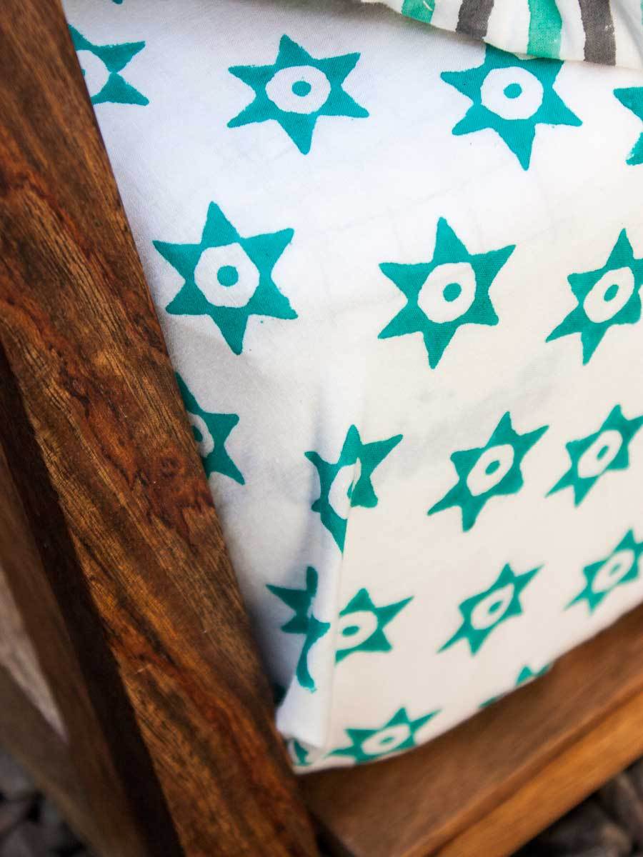 Presenting playful crib/cot hand block print GOTS certified organic cotton fitted sheets. The sheet contains elastic on the sides for easy operation and a snug fit. Made to fit all standard sizes of cots and cribs.