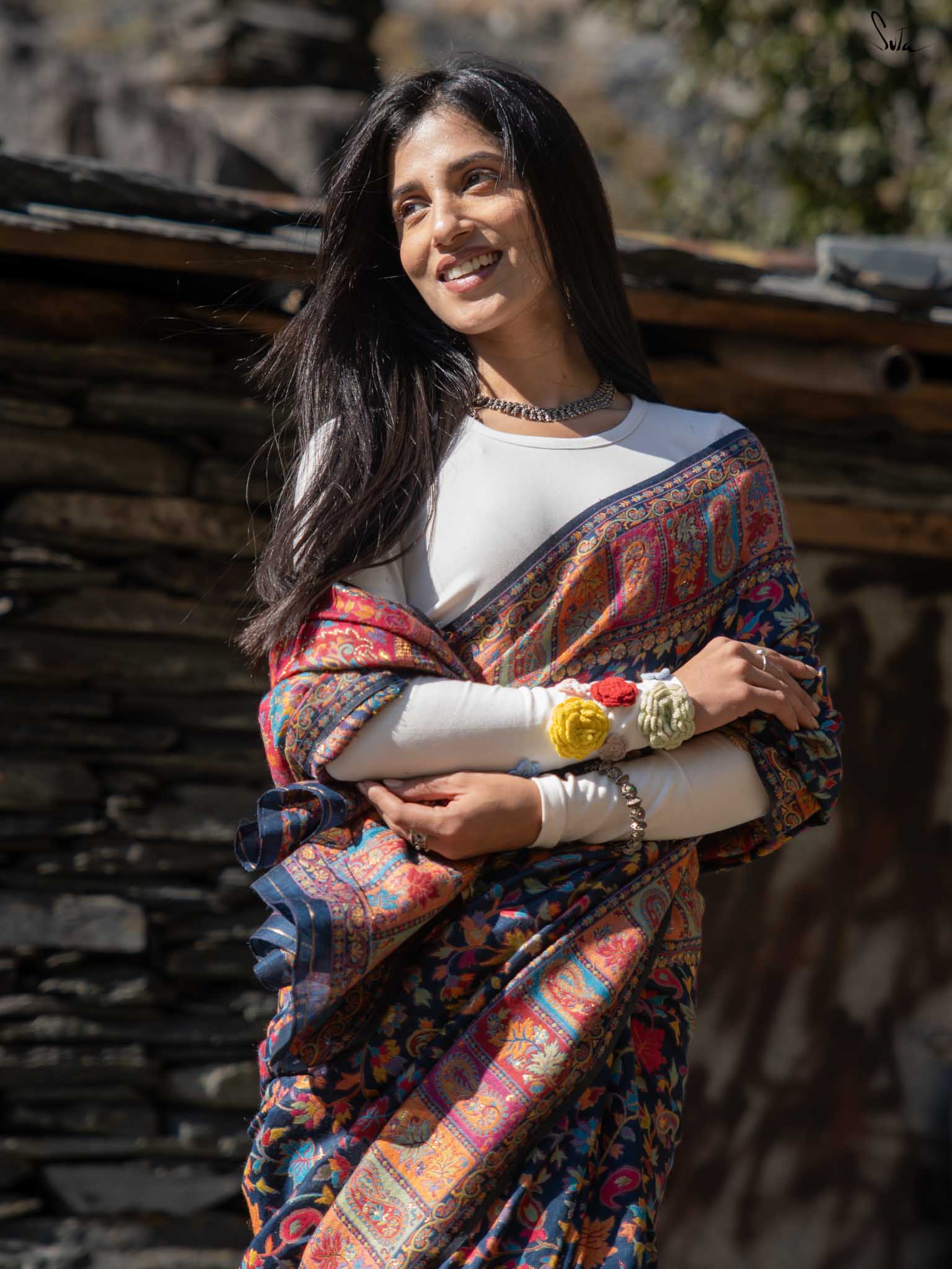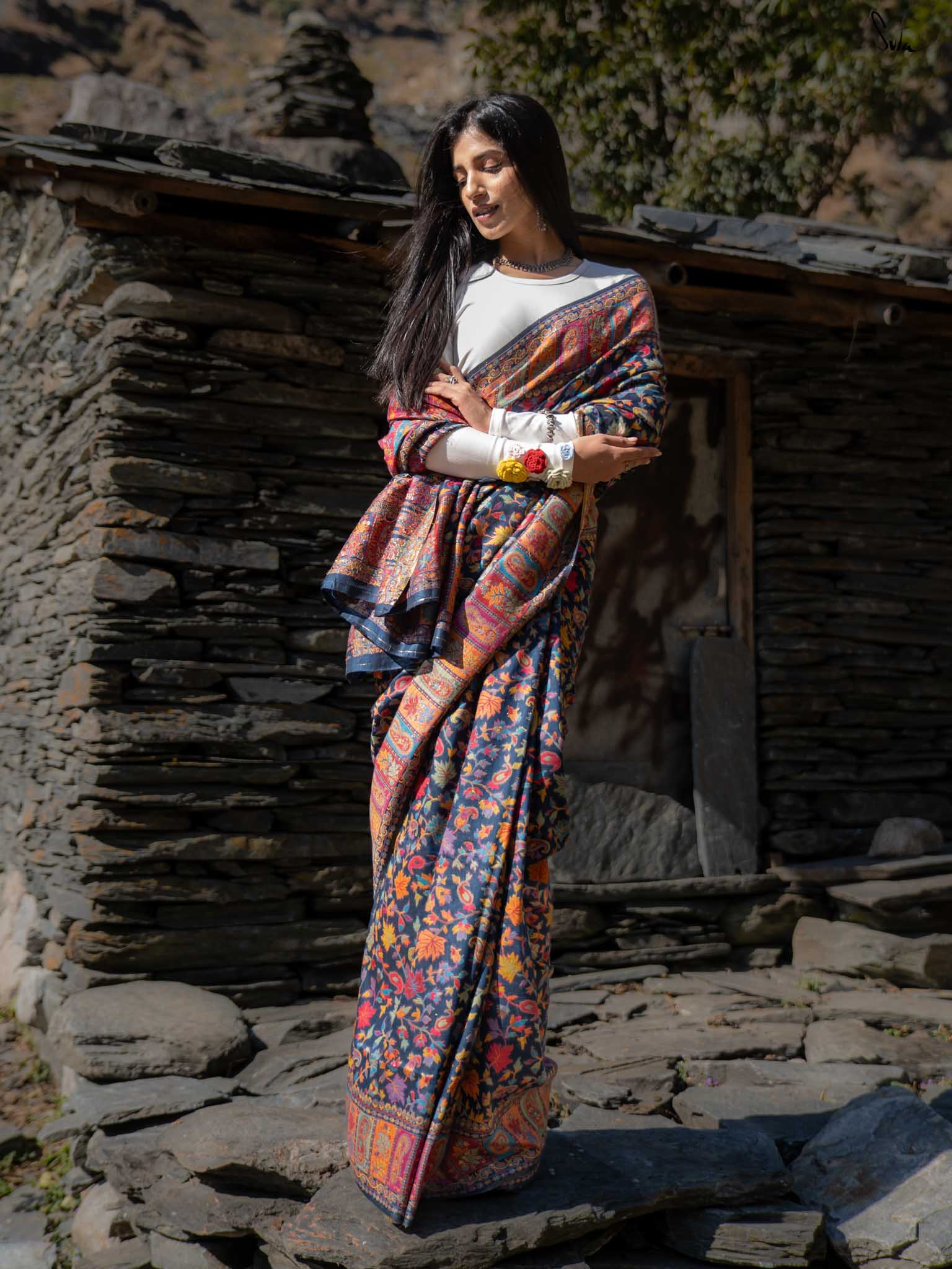 The deep blue base shines with colourful woven motifs, inspired by Kashmiri artistry and serene mountain evenings. Warm, elegant, and easy this saree blends tradition with modern charm.