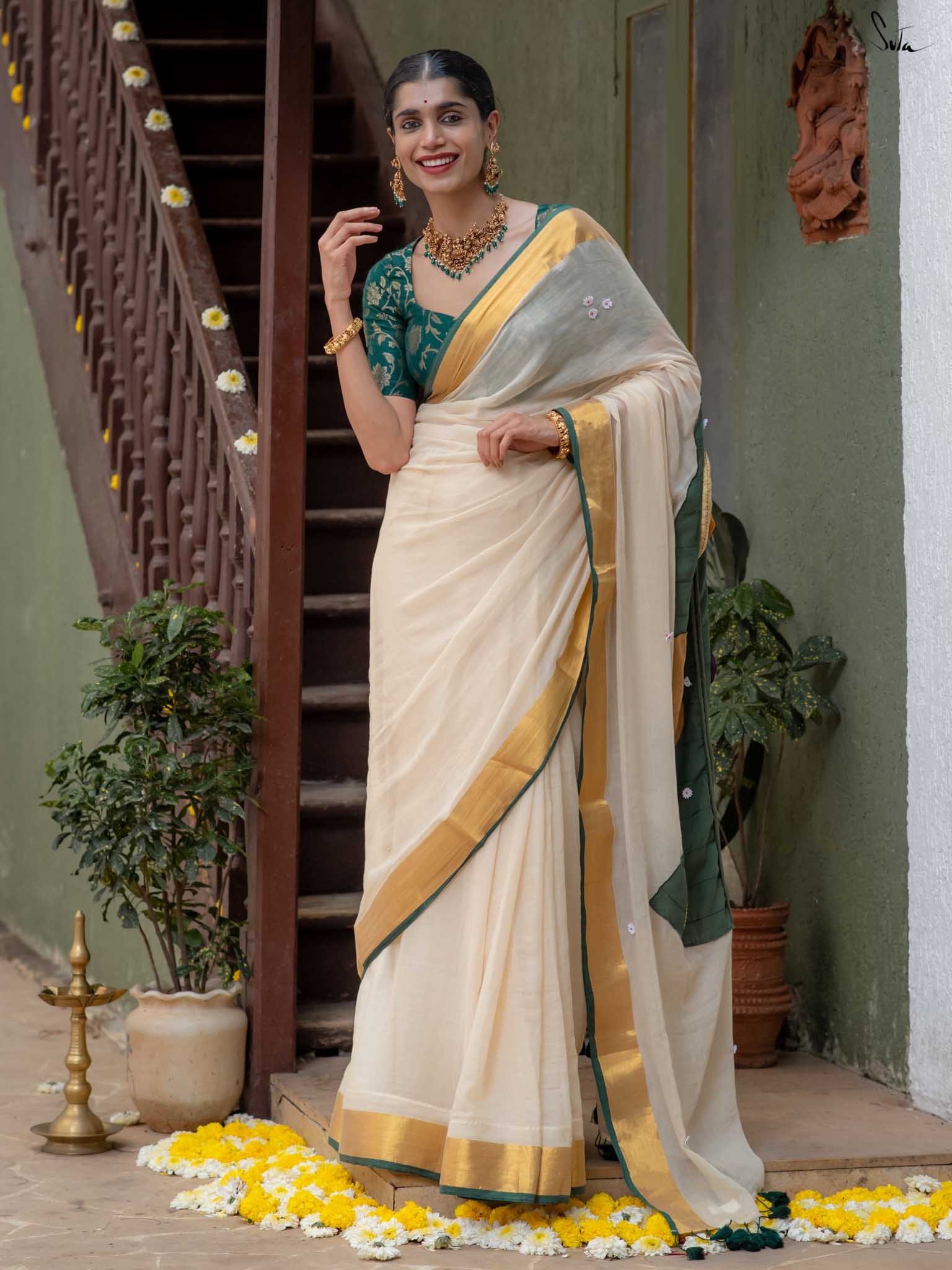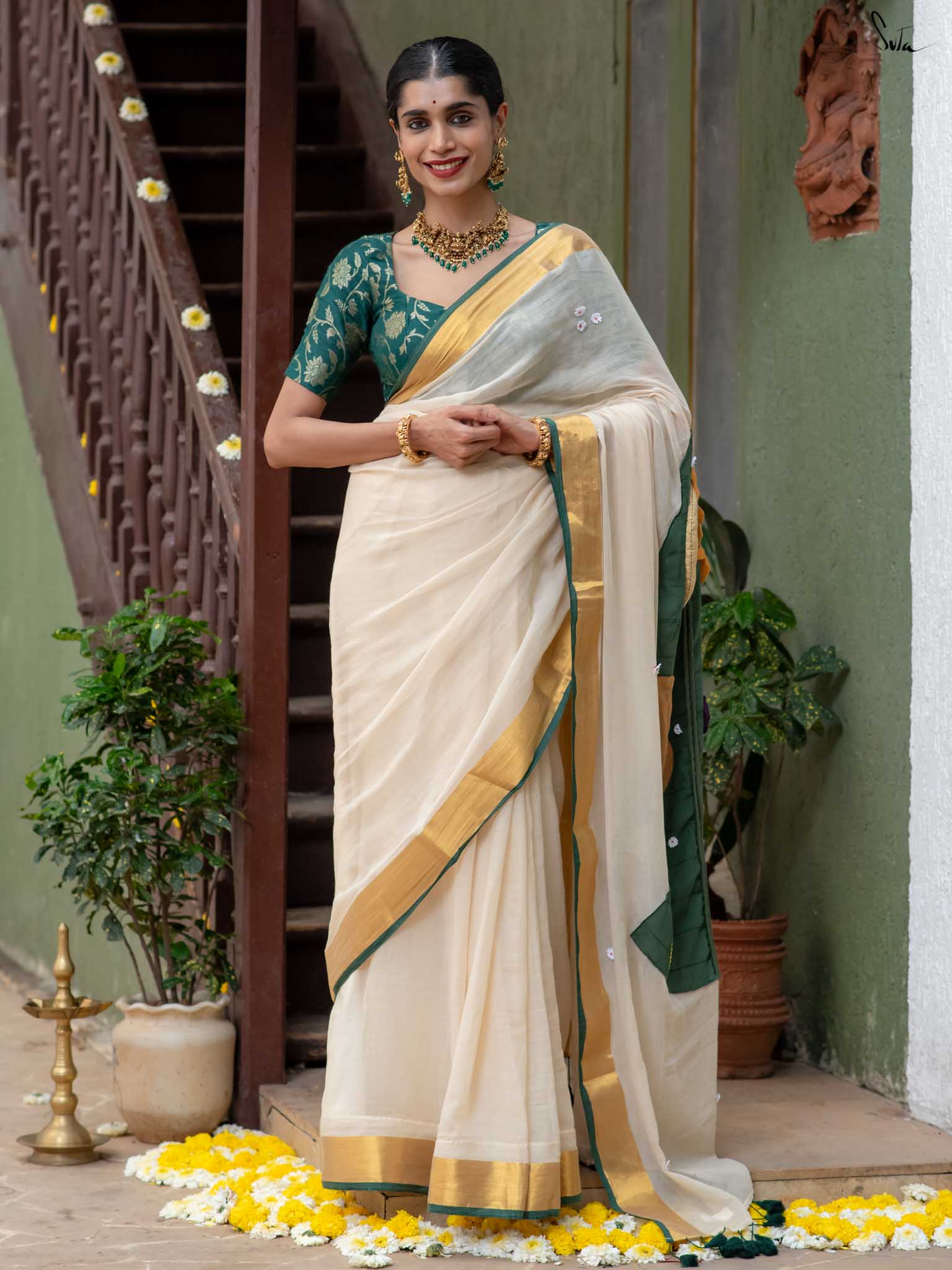 Asadhyam! is a woven mul cotton saree in a classic off-white shade, finished with a rich gold zari border. The highlight is the pallu, featuring a colourful patchwork of the iconic Onam Sadhya served on a banana leaf. Small white floral motifs are scattered across the body, adding a soft, charming touch to this joyful drape. The name Asadhyam! is a familiar Malayali expression usually said with a smile and a happy sigh after a delicious meal. This saree brings that same feeling to life: of fullness, joy, and celebrating the little things that matter.