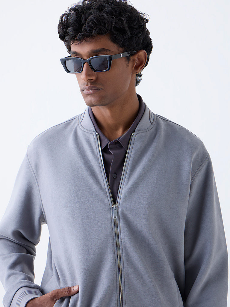 Ascot introduces this light grey jacket, tailored with a smooth suede exterior for a refined finish. Designed with a mock collar, a zipper front and full sleeves, it is complemented with kangaroo pockets at the front for utility. Lightweight in feel yet polished in appearance, it makes a versatile layer for modern wardrobes.