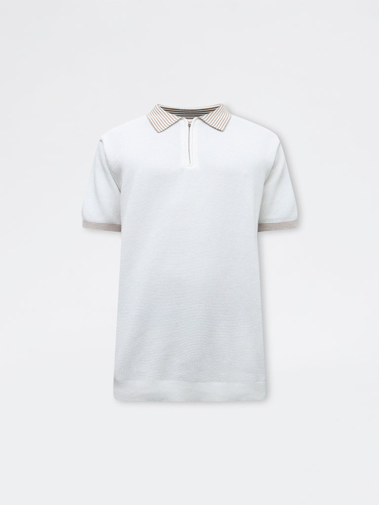 Ascot brings a refined update to everyday dressing with this off-white polo t-shirt. Sculpted in a relaxed silhouette from a soft, breathable fabric, it offers lasting comfort through the day. Designed with a stripe-printed collar, a short zipper placket and short sleeves, the piece is finished with a tactile textured surface that enhances its structured silhouette. Suitable for both casual outings and workday looks.