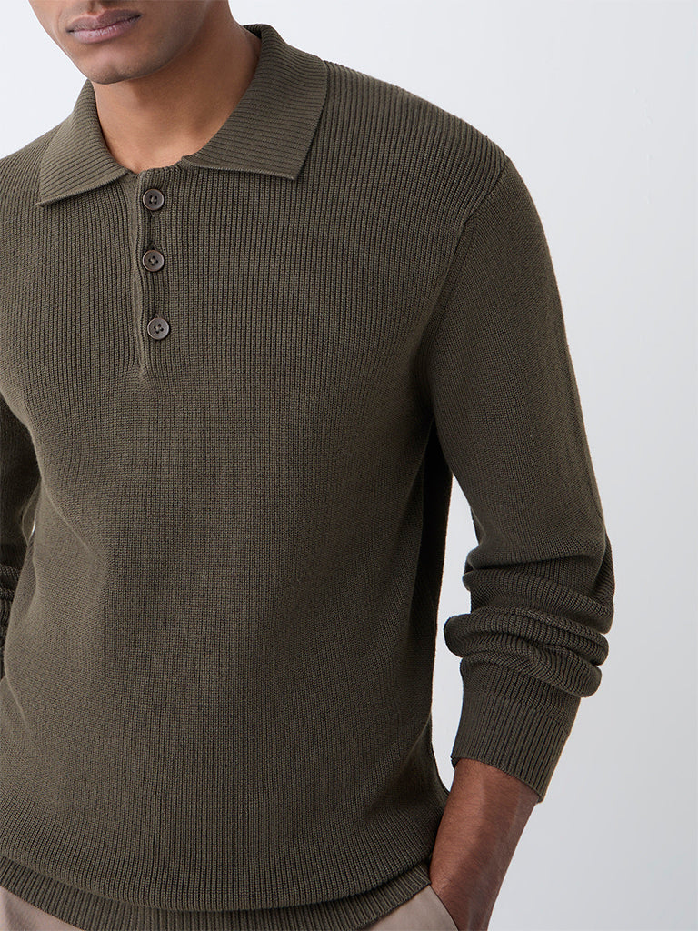 Ascot launches this olive polo sweater tailored for warmth, comfort, and easy sophistication. Made from a cotton-blend fabric and cut in a relaxed frame, it features full sleeves, a spread collar, and a quarter button placket. The refined knit texture brings a sleek, elevated finish to winter dressing.