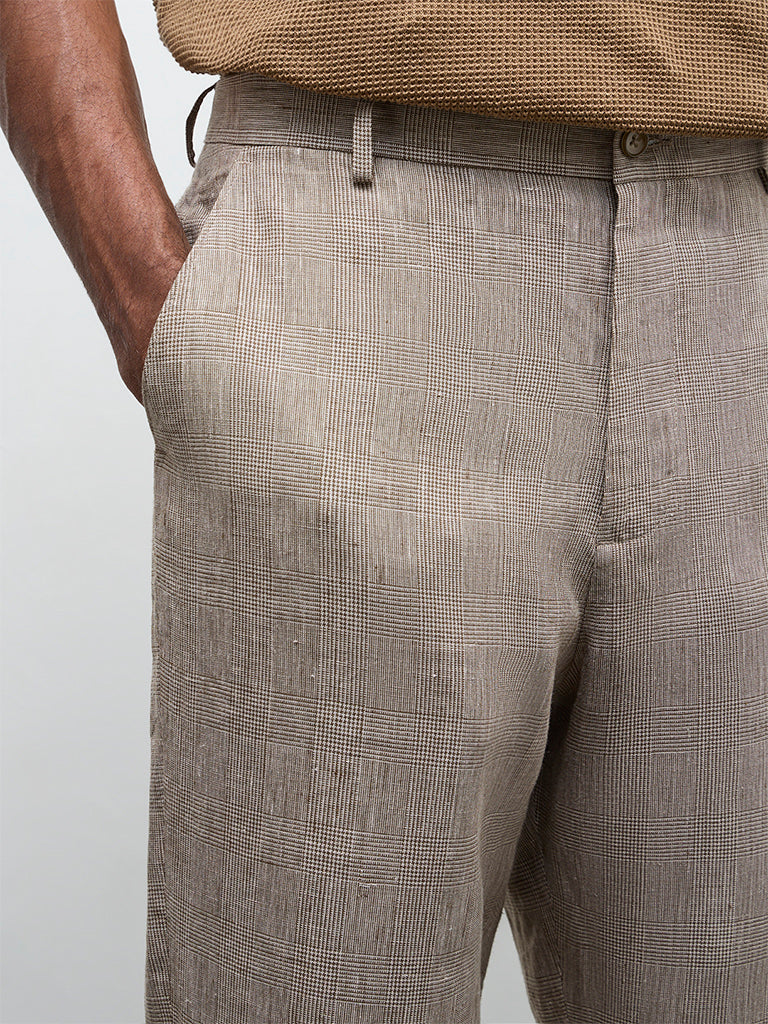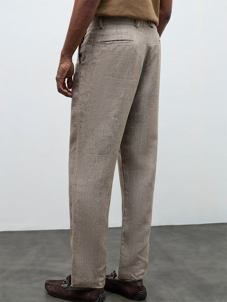 Ascot Taupe Checkered Relaxed-Fit Mid-Rise Linen Trousers