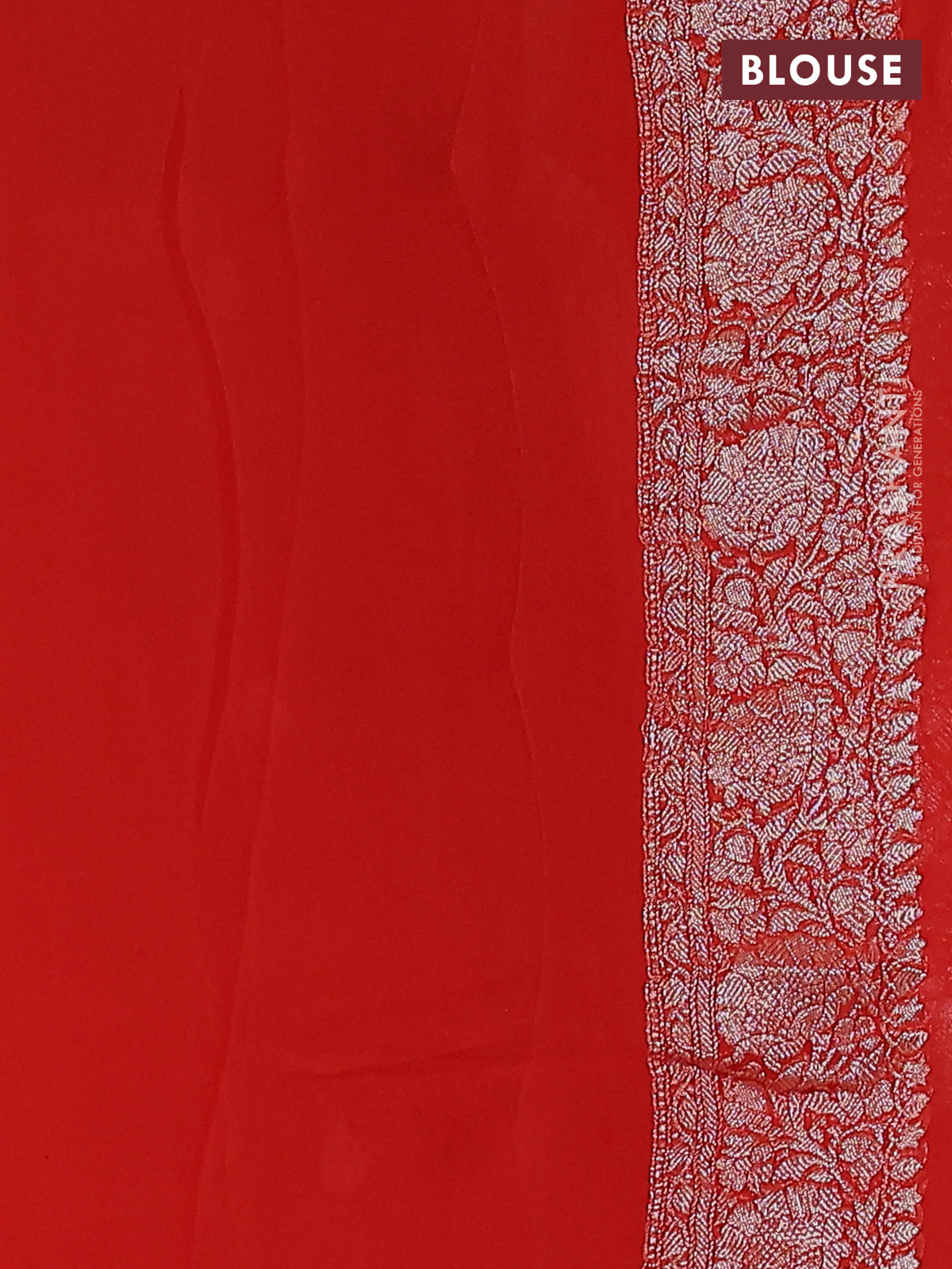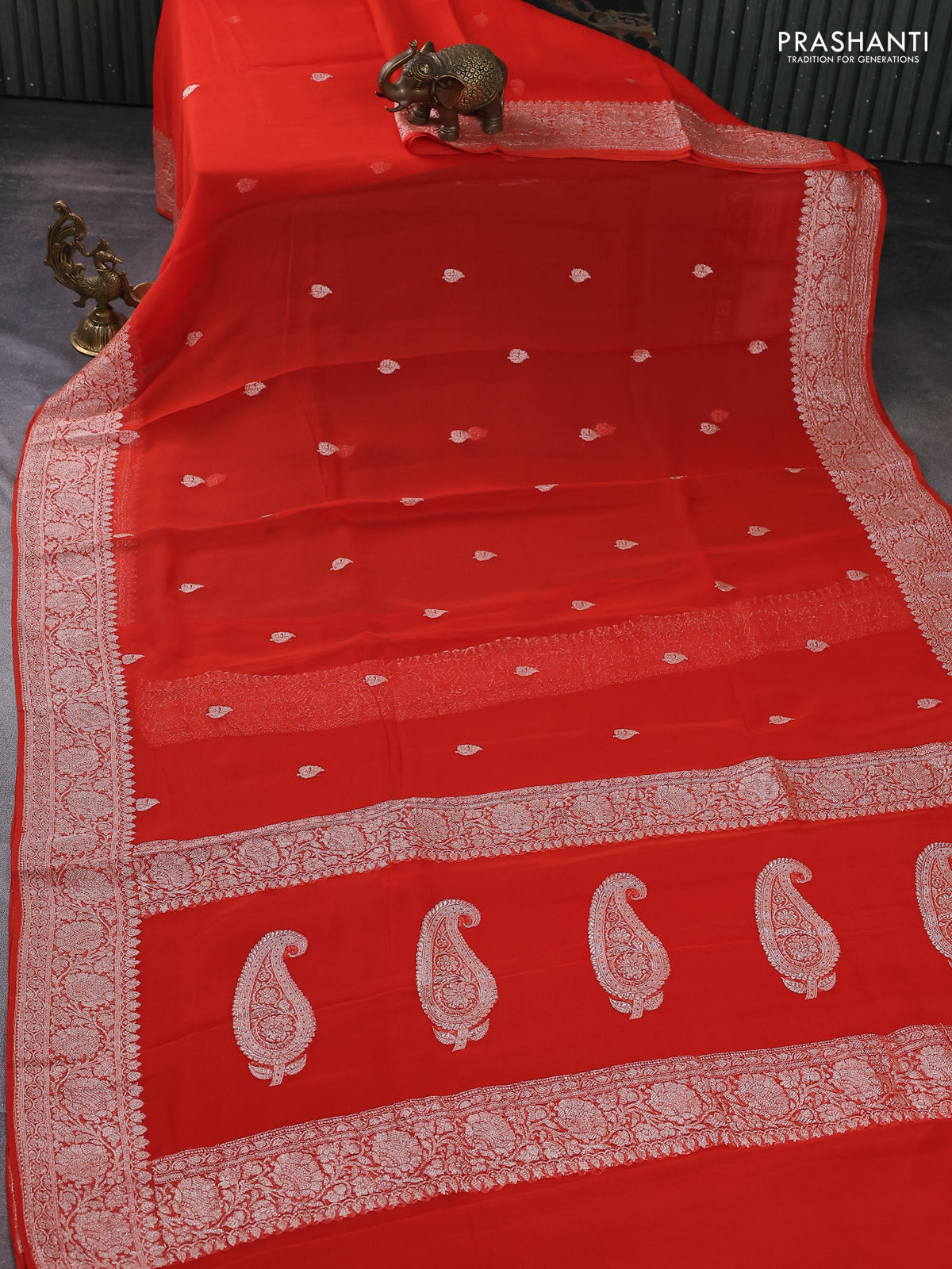 Banarasi chiffon silk saree orange with silver zari woven buttas and floral silver zari woven border