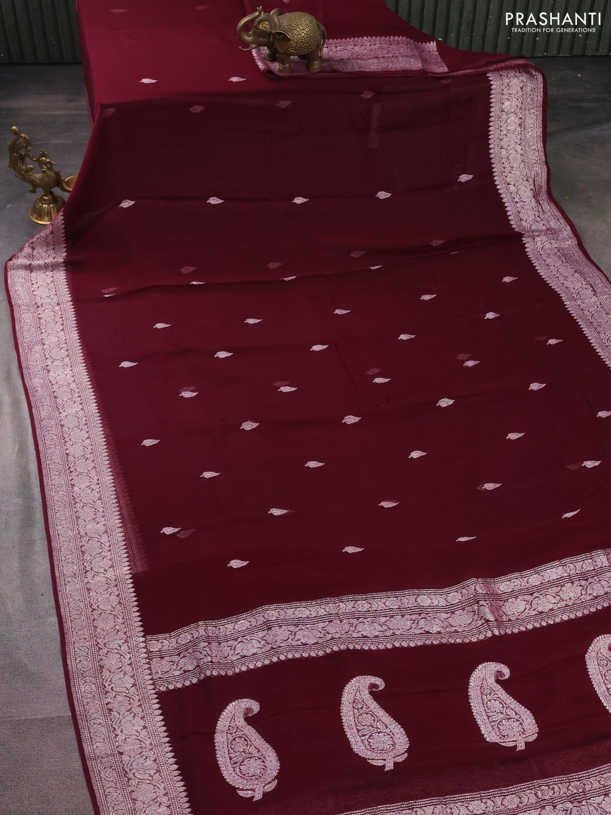 Banarasi chiffon silk saree wine shade with silver zari woven buttas and silver zari woven border