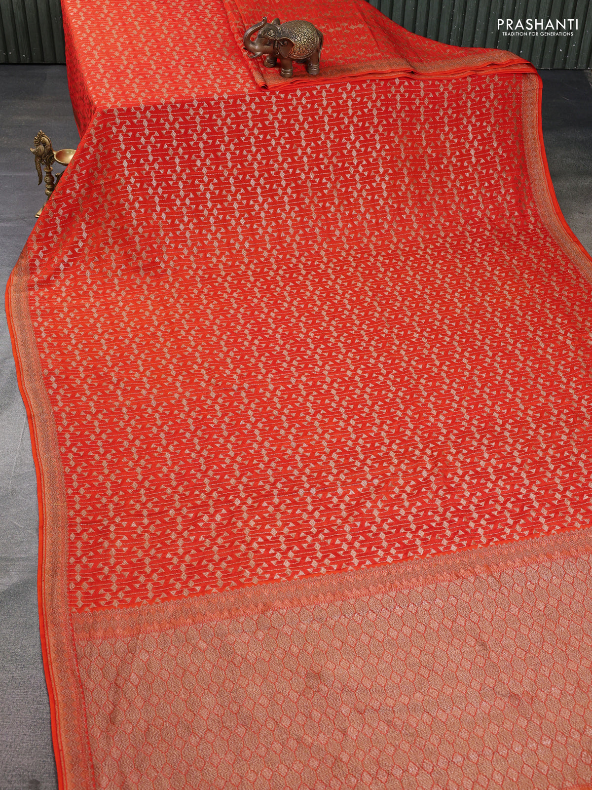 Banarasi crepe saree orange with allover geometric weaves and woven border