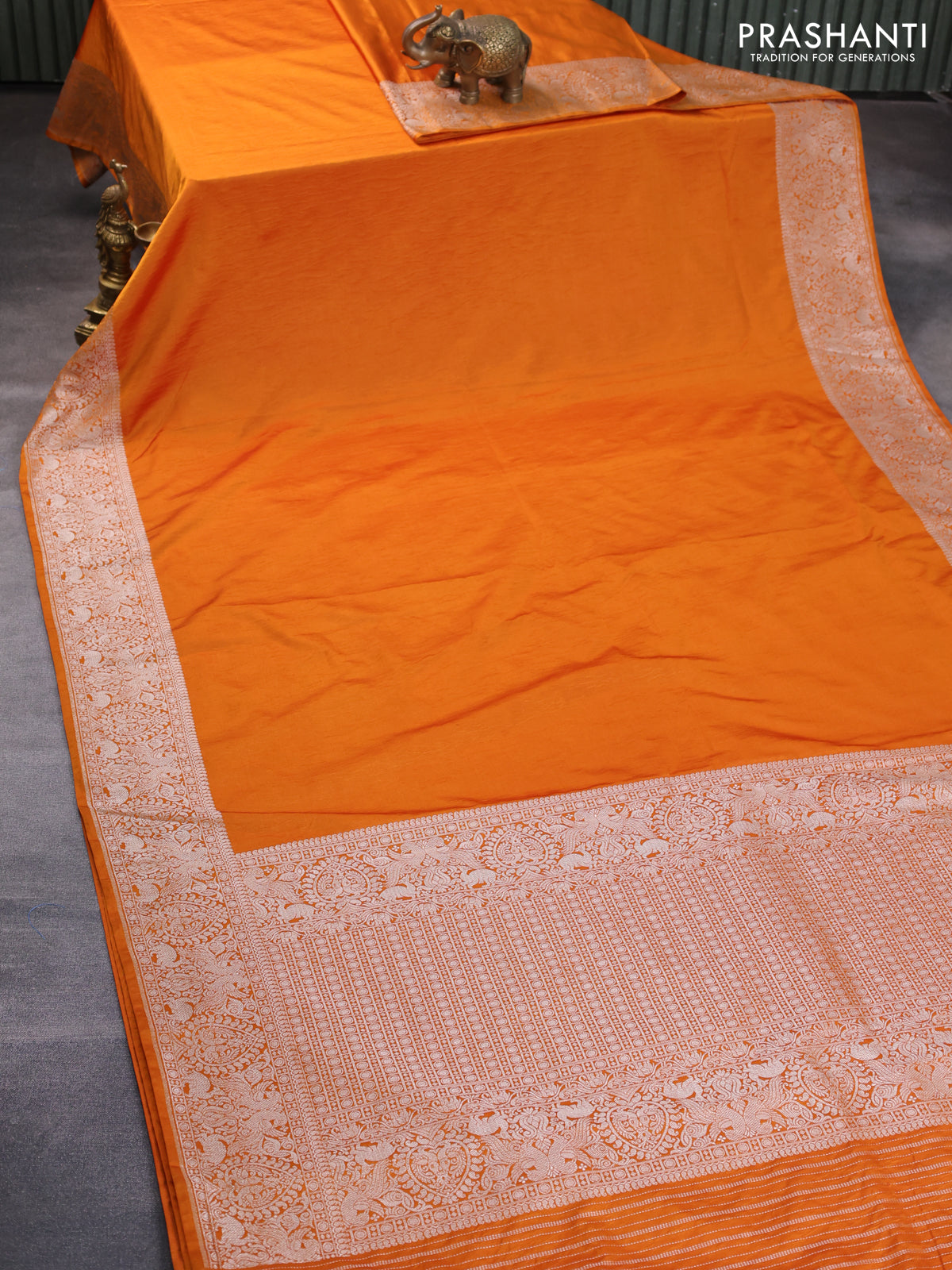 Banarasi crush crepe saree mustard yellow with plain body and silver zari woven border