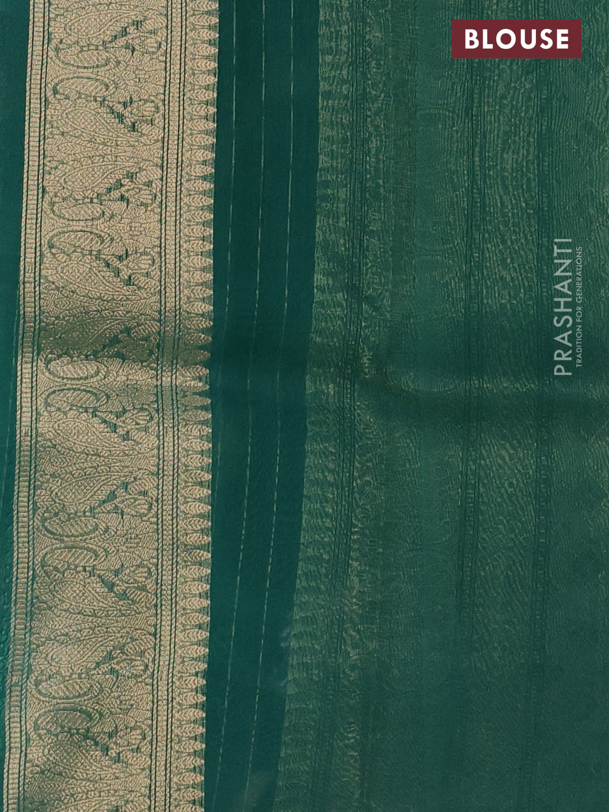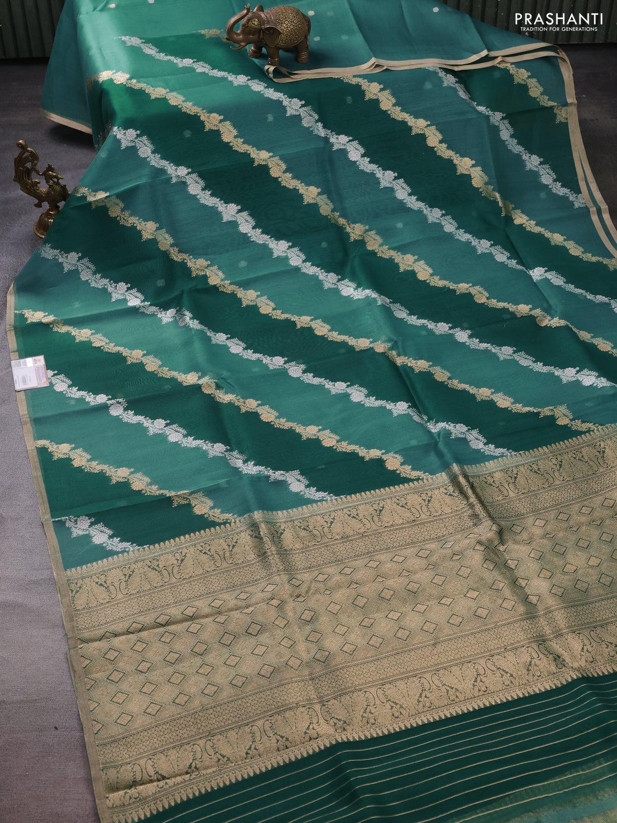 Banarasi organza silk saree teal green shade with silver & gold zari weaves and zari woven piping boder