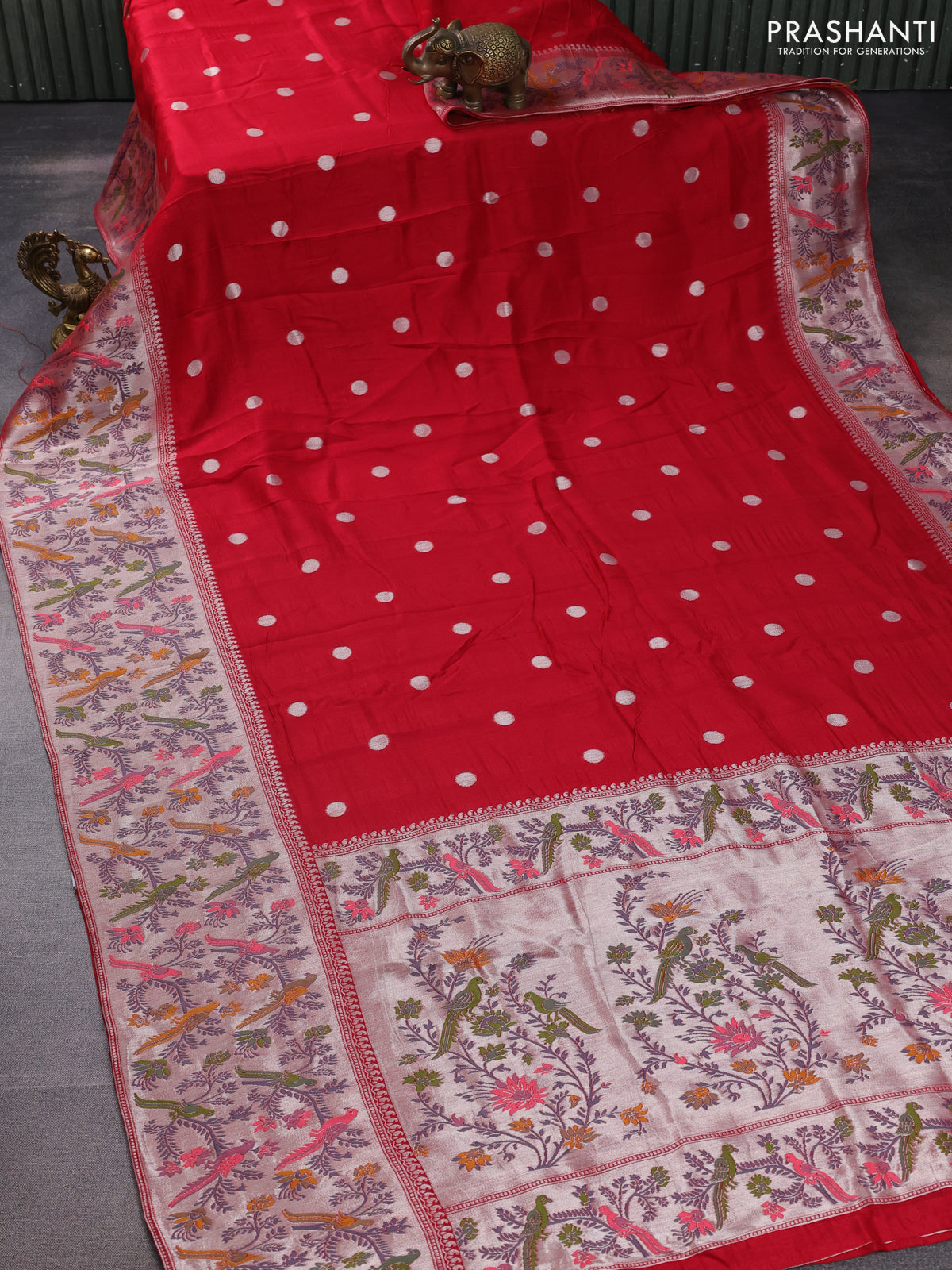 Banarasi raw silk saree red with sillver zari woven coin buttas and silver zari woven paithani style border