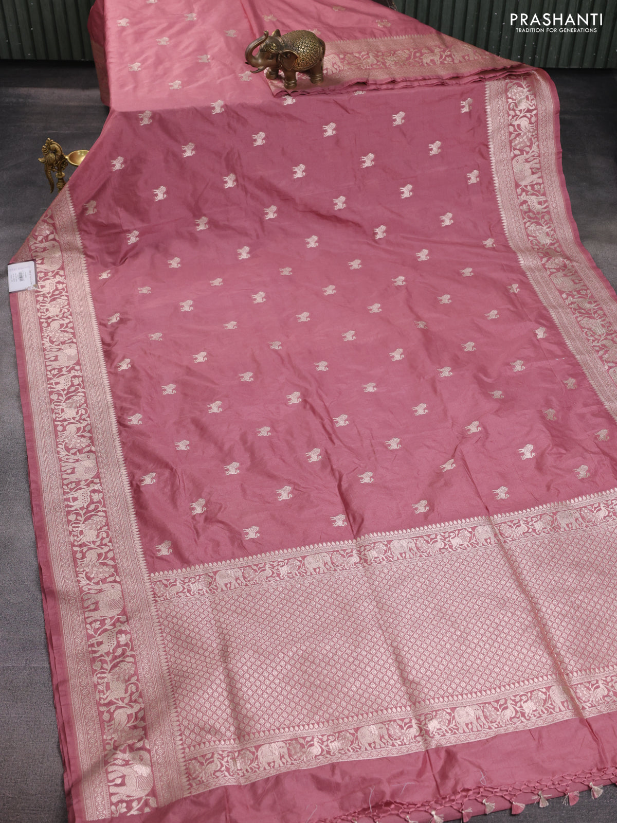 Banarasi semi katan saree pastel peach with lion zari woven buttas and rich zari woven butta border