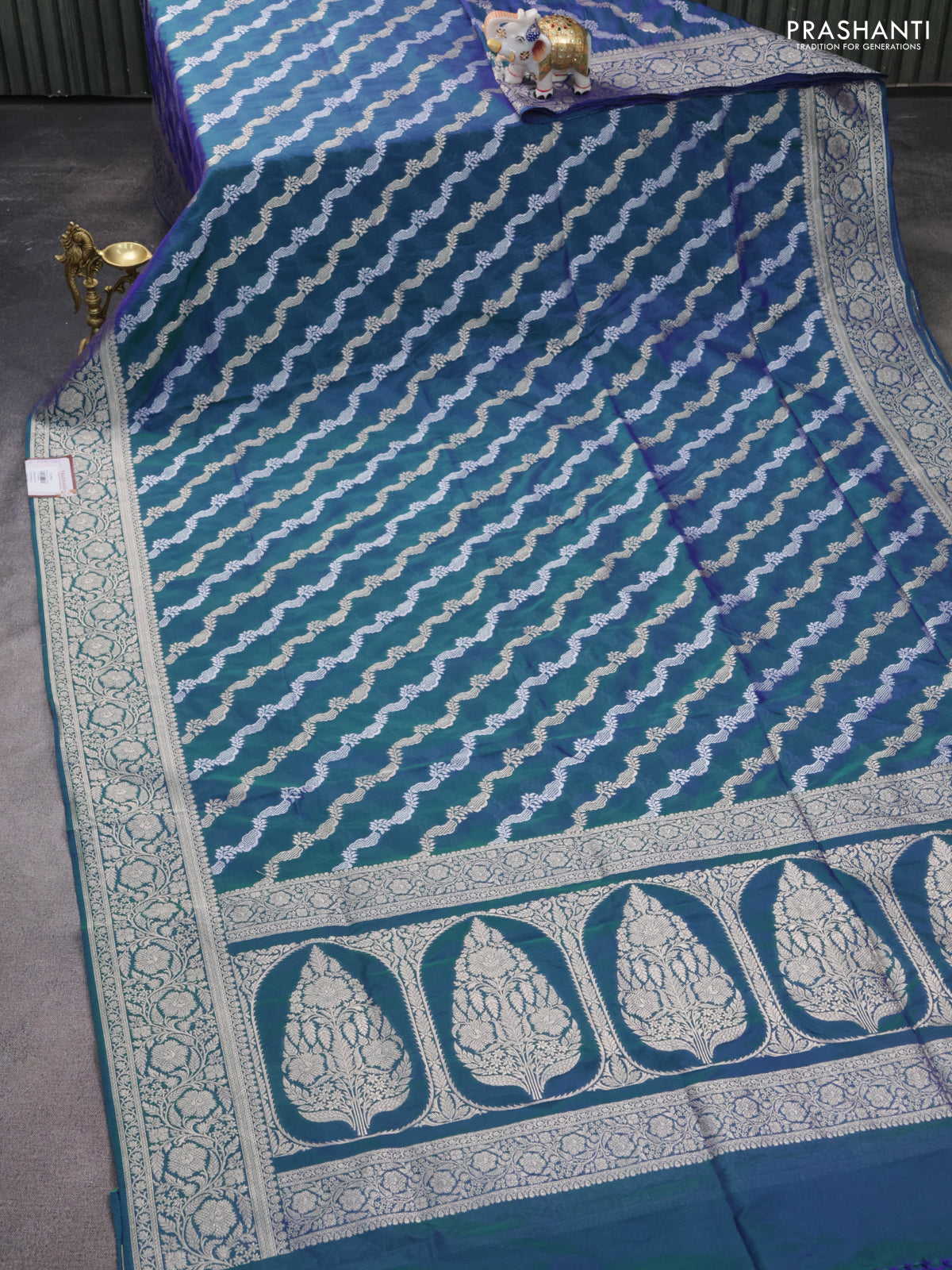 Banarasi semi katan silk saree dual shade of bluish green with allover silver & gold zari weaves and floral zari woven border
