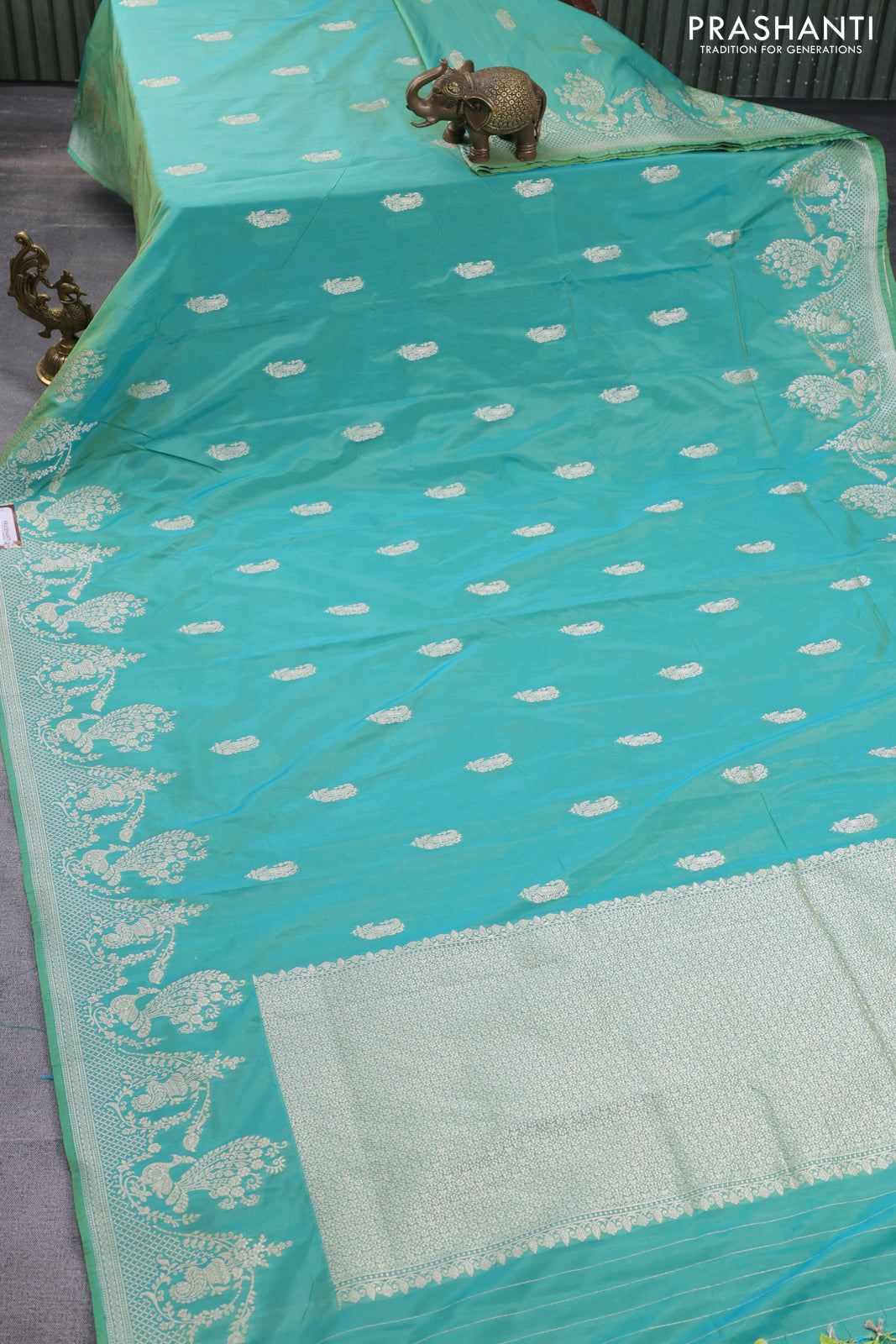 Banarasi semi katan silk saree teal bluish green with zari woven buttas and rich zari woven border