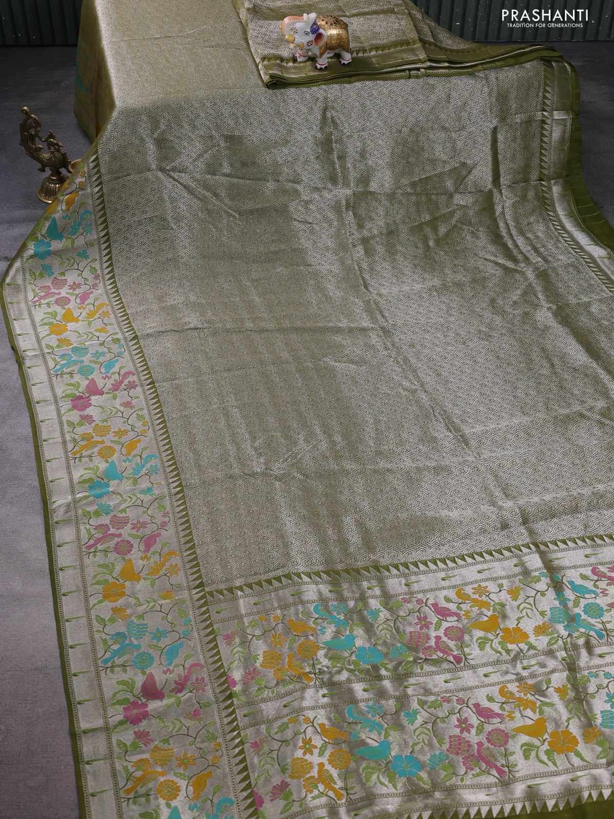 Banarasi semi raw silk saree mehendi green with allover silver woven brocade weaves and floral design paithani border
