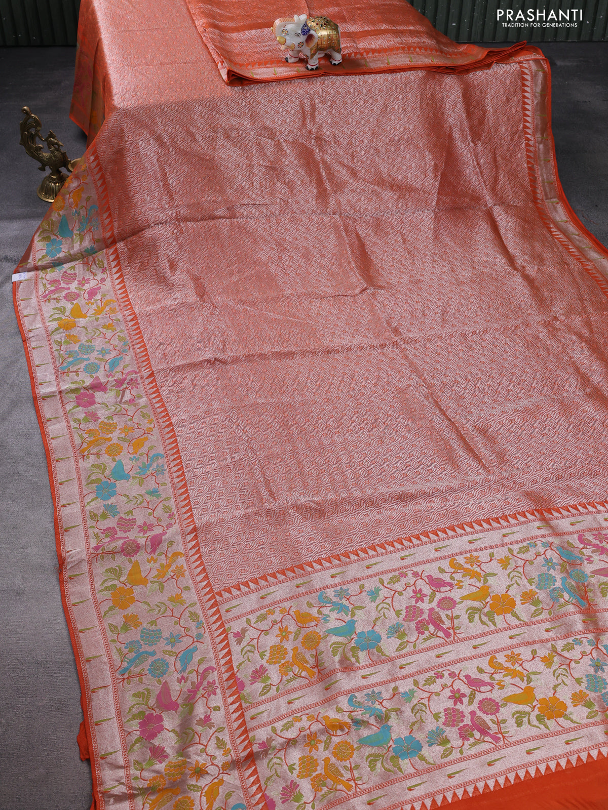Banarasi semi raw silk saree orange with allover silver woven brocade weaves and floral design paithani border
