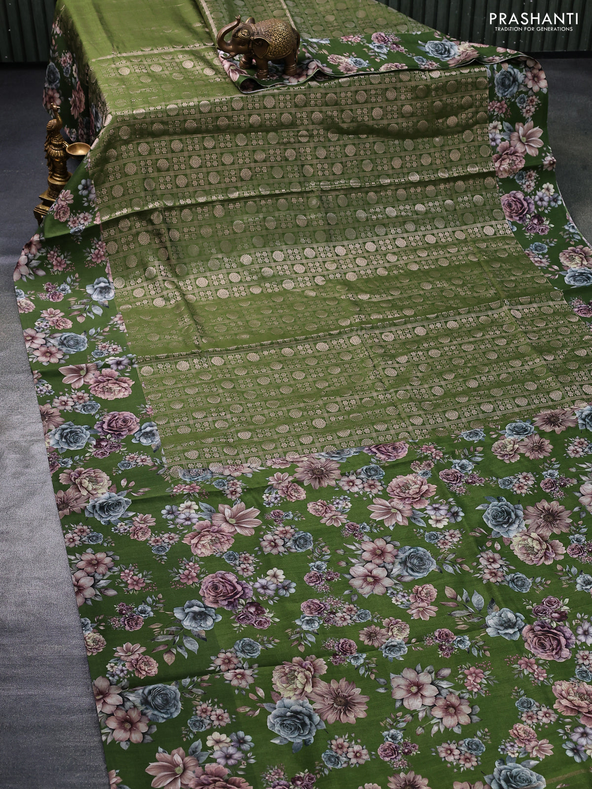 Banarasi silk saree green with allover zari woven brocade weaves and floral digital printed border