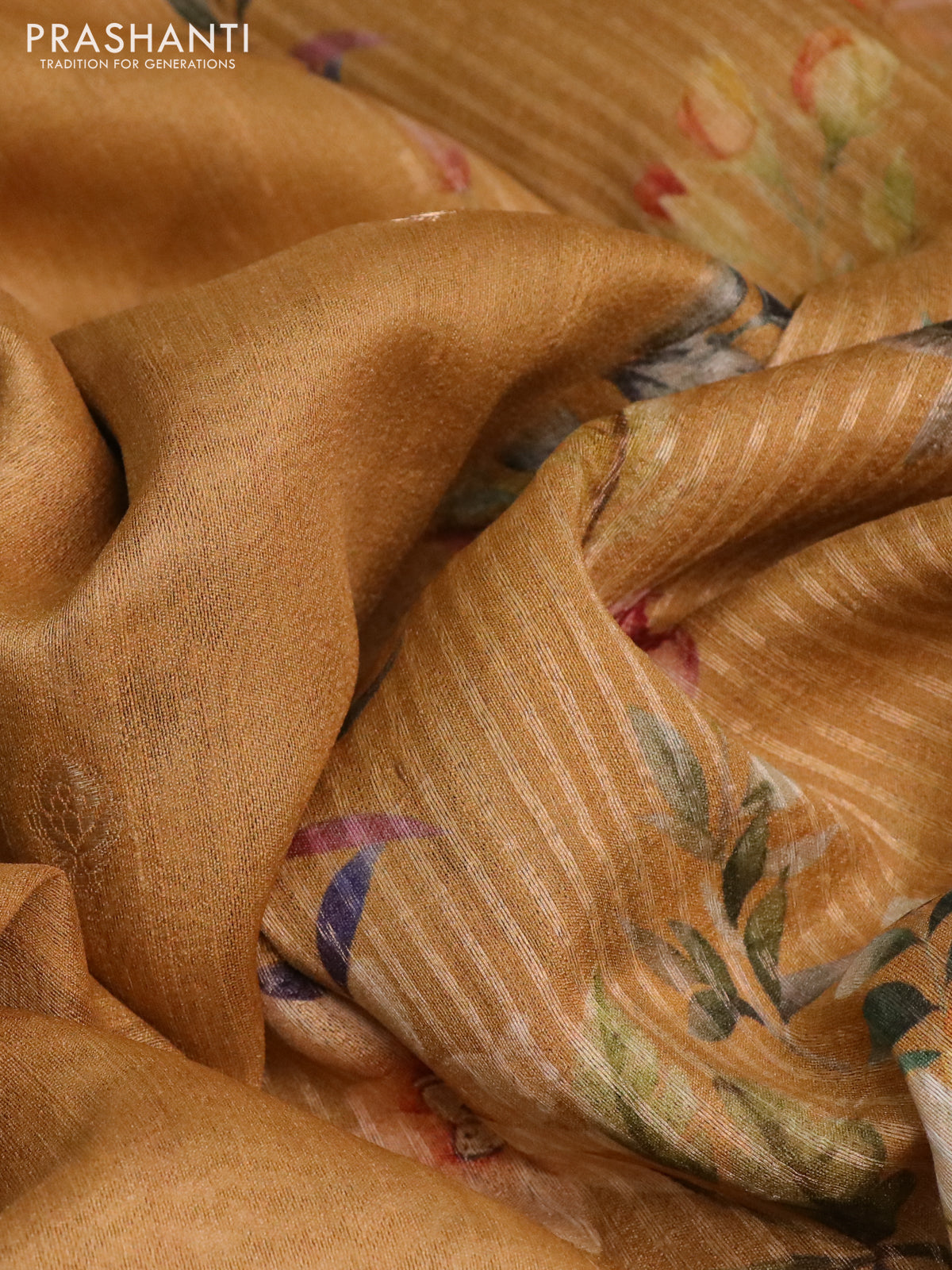 Banarasi tussar silk saree mustard yellow with zari woven buttas and zari woven floral digital printed border