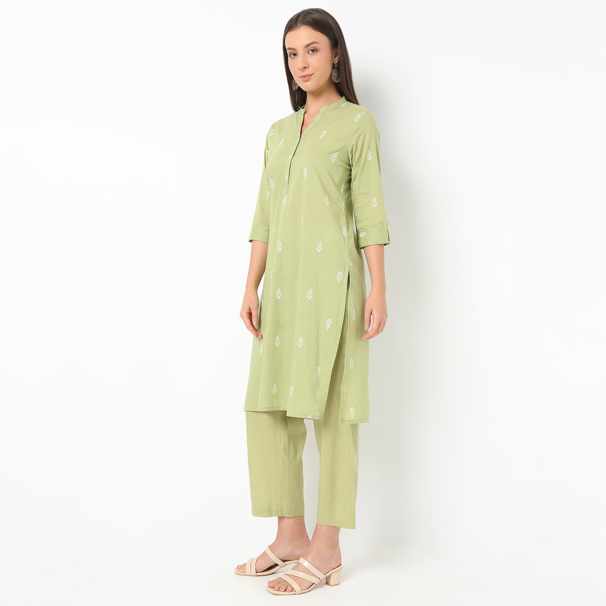 Band Neck Knee Length Three-Fourth Sleeve Printed Straight Fit Kurta