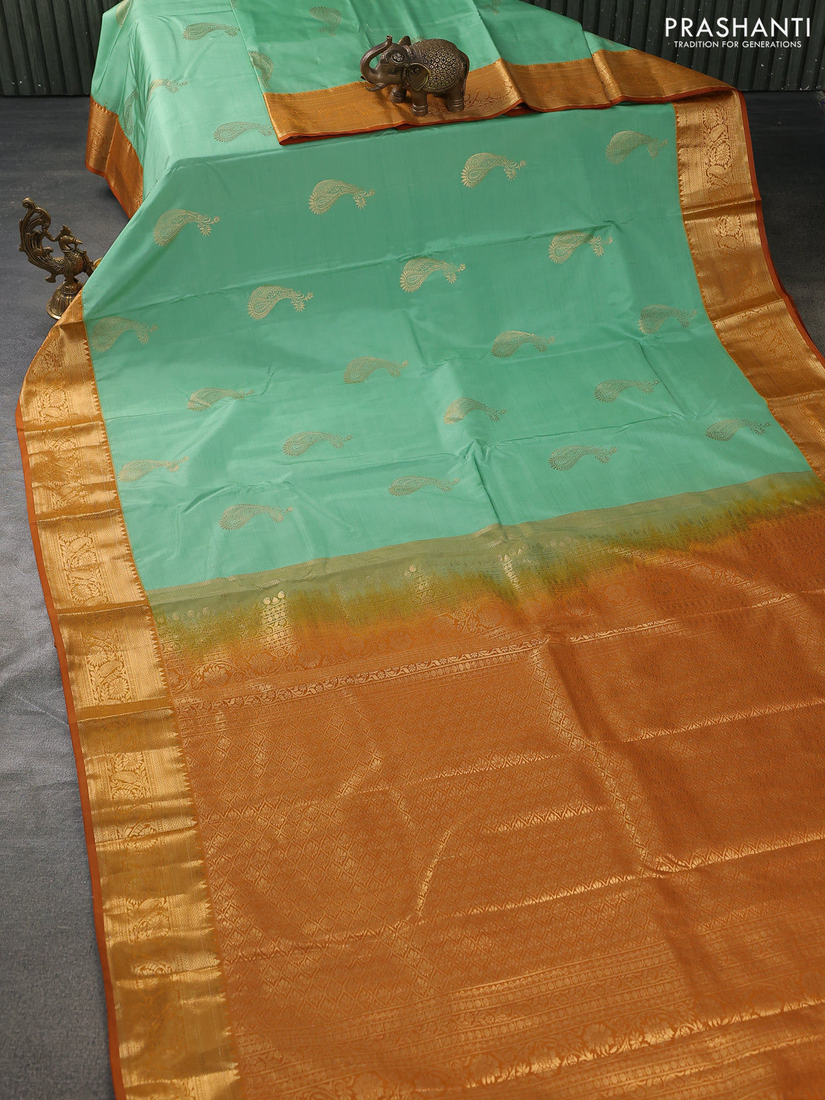 Bangalori silk saree pastel green and dark mustard with zari woven buttas and zari woven border