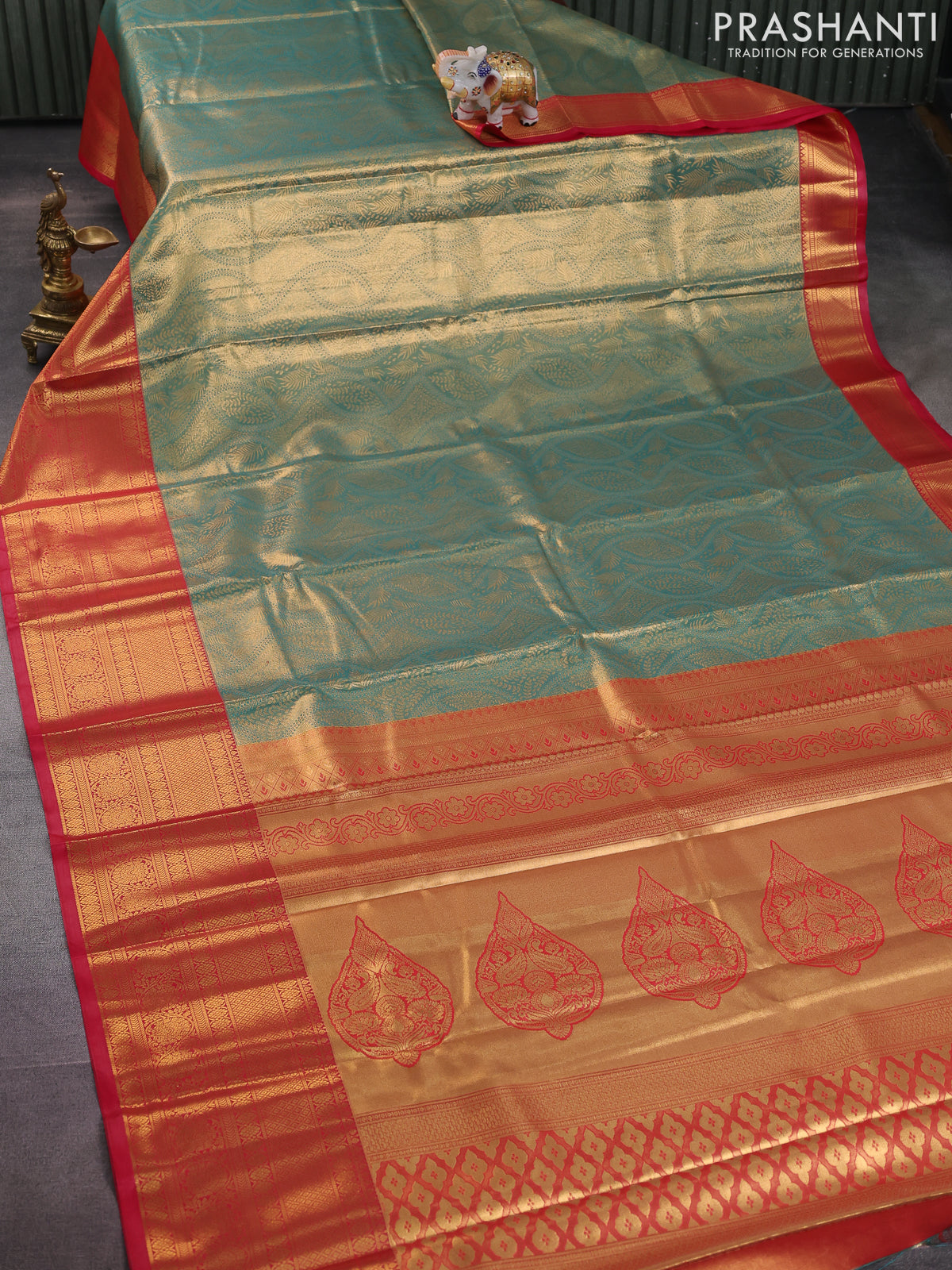 Bangalori tissue silk saree teal green and reddish pink with allover zari woven brocade weaves and long zari woven border