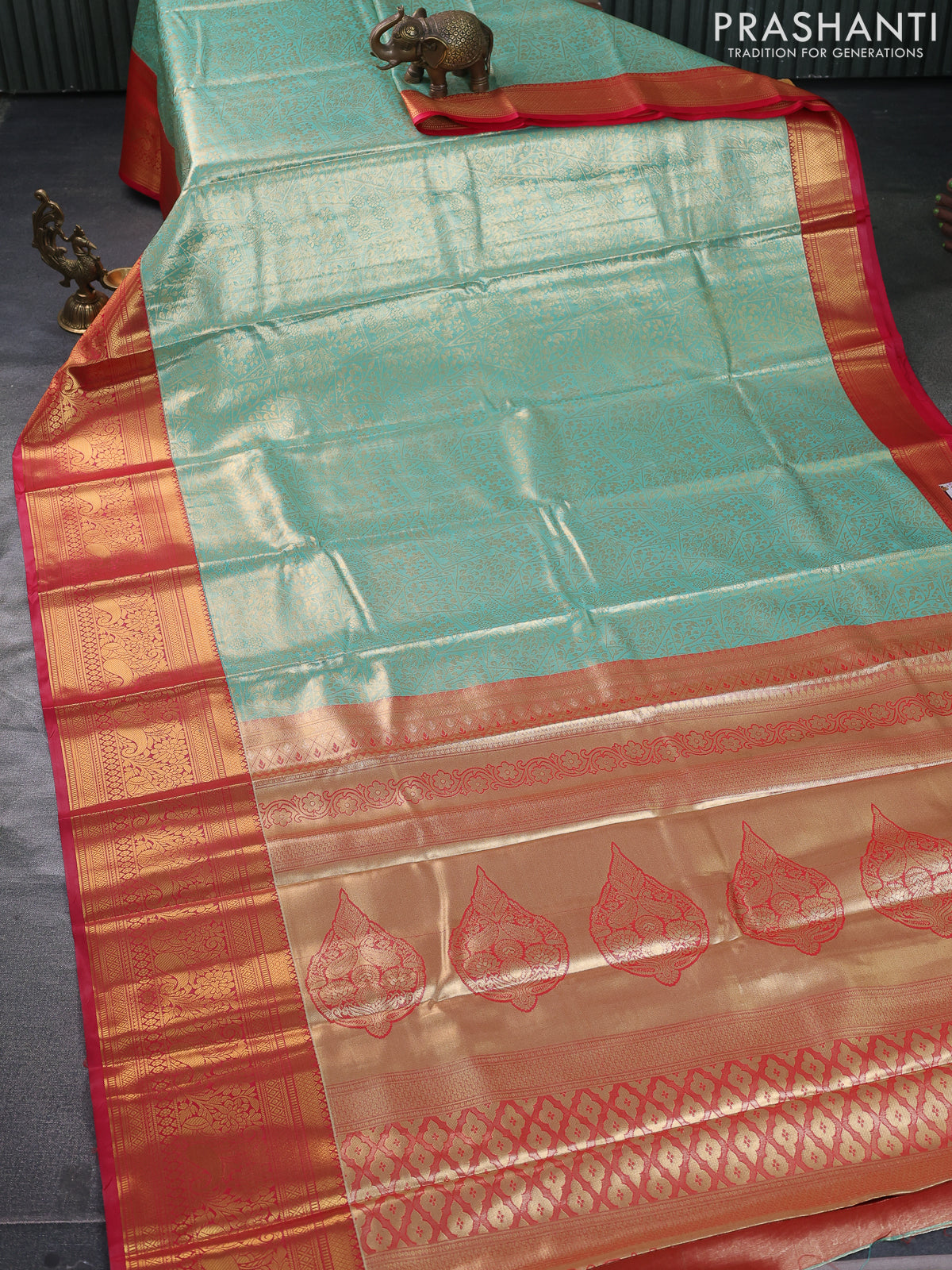 Bangalori tissue silk saree teal shade and pink with allover zari woven brocade weaves and long zari woven border