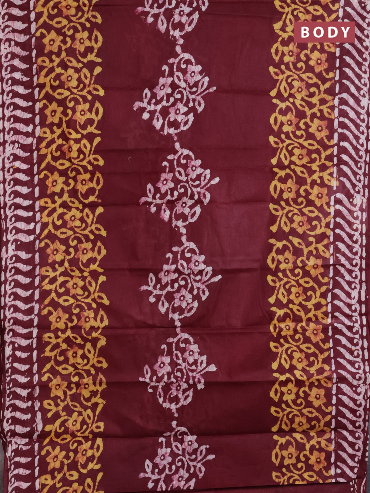 Batik cotton saree deep marron and mustard yellow with batik prints and long printed border