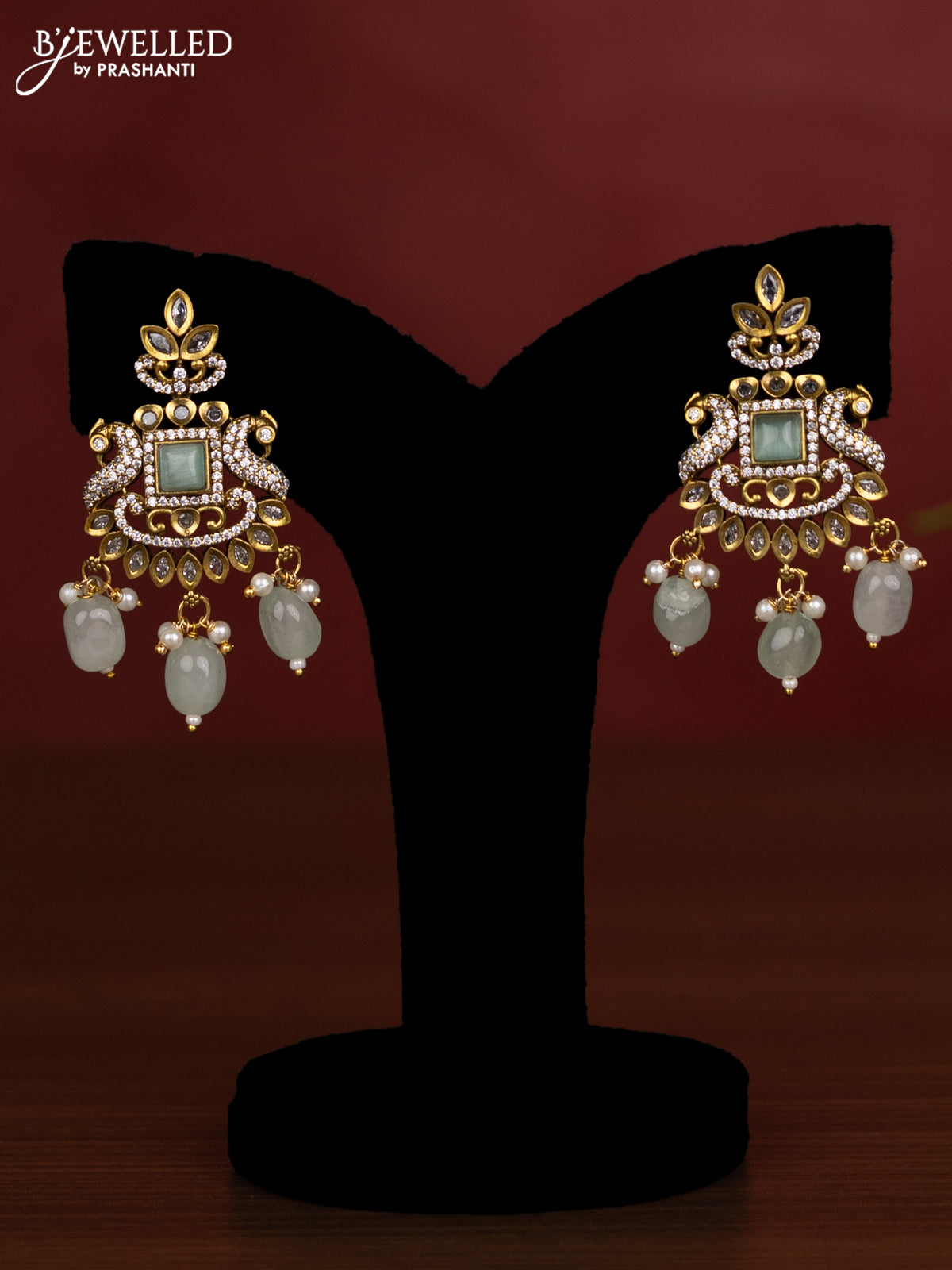 Beaded double layer mint green necklace with cz stones and pearl & beads hanging in victorian finish