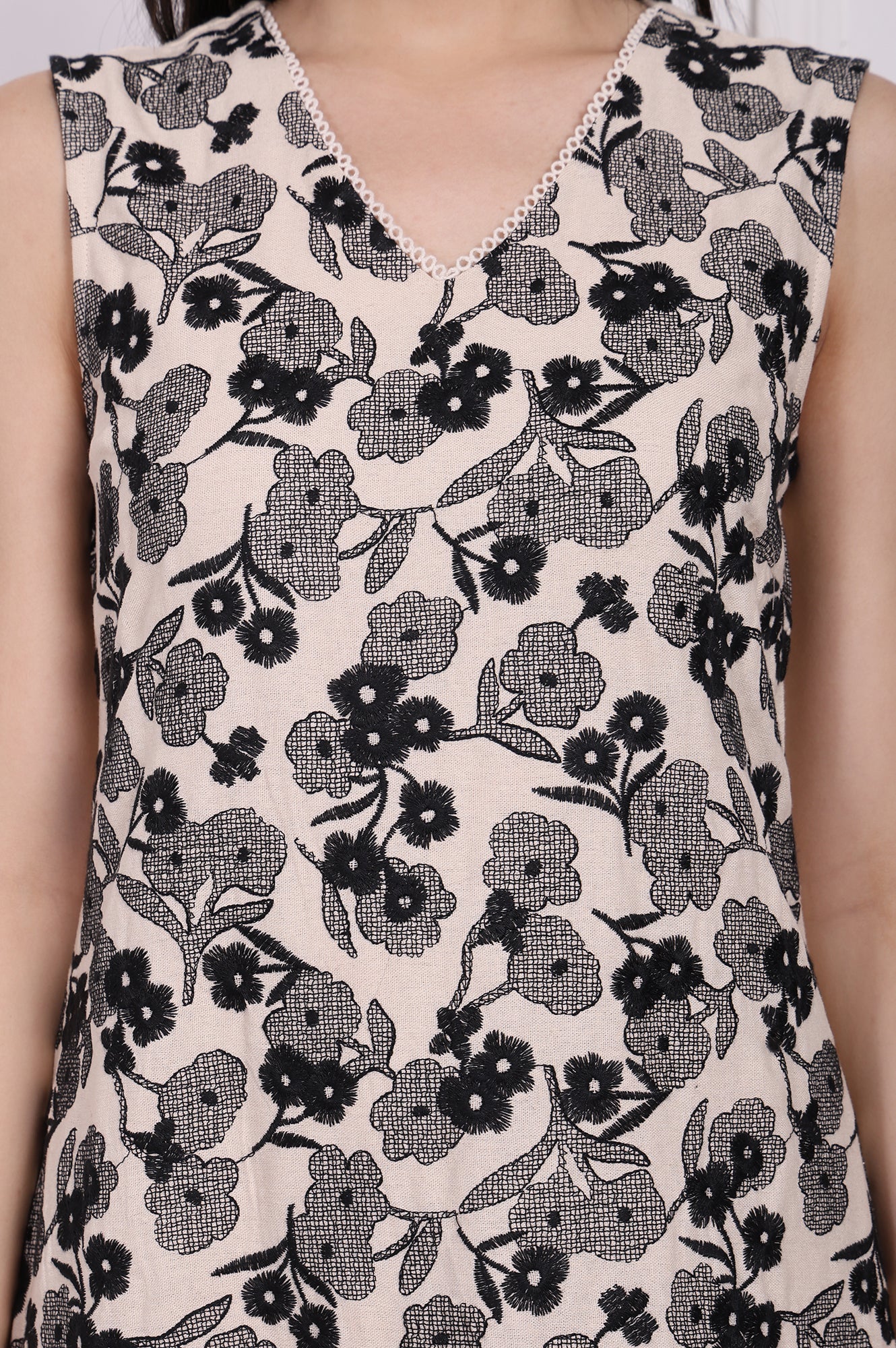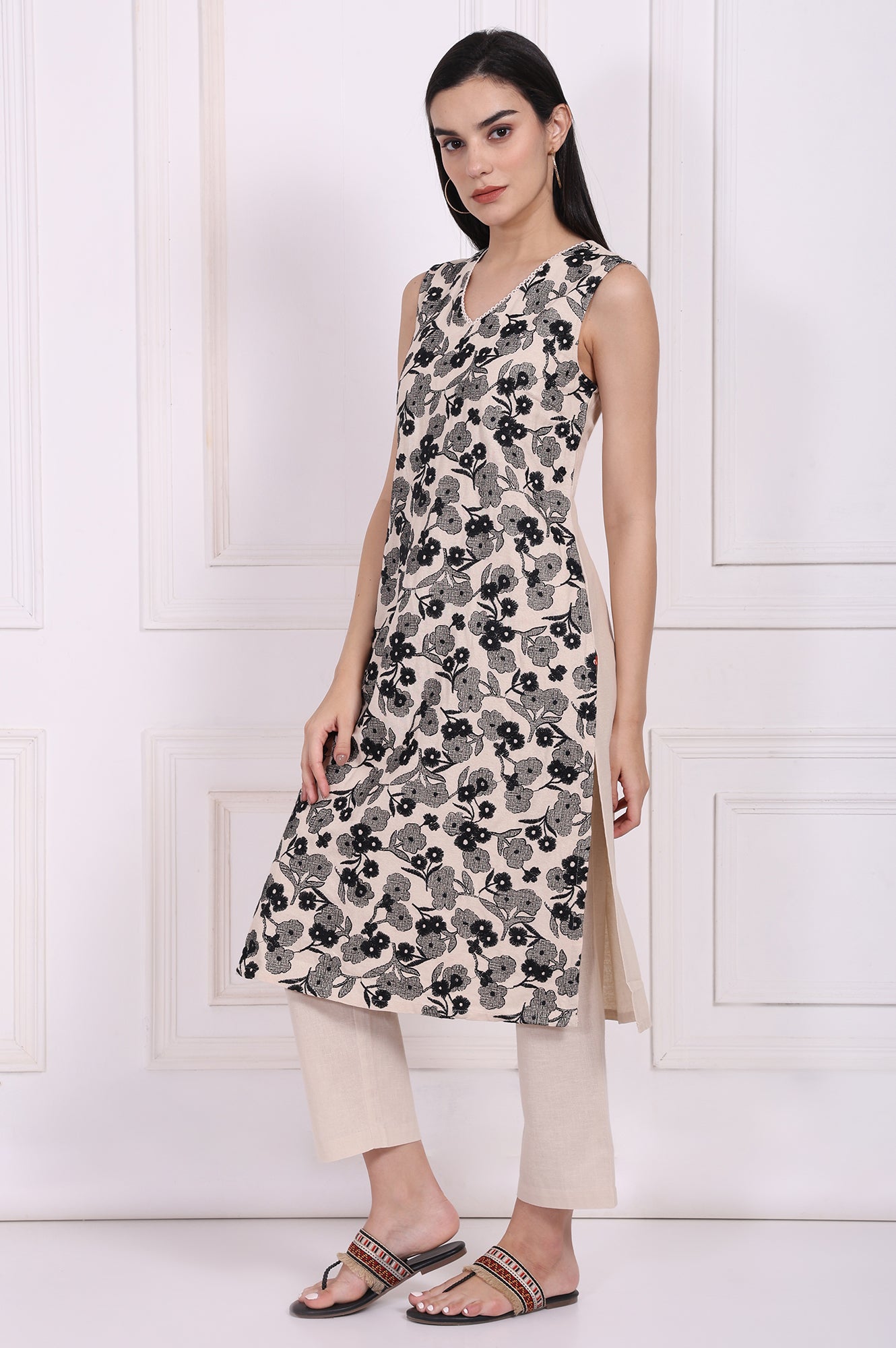 A portrait of modern grace, this Natural Ecru kurta set for women is a study in sophisticated contrasts. The sleeveless A-line kurta glides over the frame, offering a silhouette that’s both flattering and supremely comfortable for all-day wear. Its entire front panel is a canvas for intricate floral embroidery, rendered in a bold black thread that stands out against the serene base, creating a stunning visual texture that feels luxurious to the touch. This beautiful ethnic co-ord set is perfect for those who appreciate detailed craftsmanship. The kurta features an elegant V-neckline, which is delicately finished with a fine lace trim for an added touch of femininity and charm. High side slits on the straight hemline ensure graceful movement, while the solid back provides a moment of chic simplicity. Designed for effortless style, this kurti set is a masterpiece of contemporary ethnic wear. The ensemble includes a pair of minimalist straight pants, crafted from the same comfortable fabric for a cohesive look. These pants come with an elasticated waistband ensuring a perfect, flexible fit and feature a handy side pocket for your essentials. This embroidered kurta pant set is ideal for brunches, festive gatherings, or any day you choose to celebrate your personal style. It’s a timeless two-piece ensemble you'll treasure.