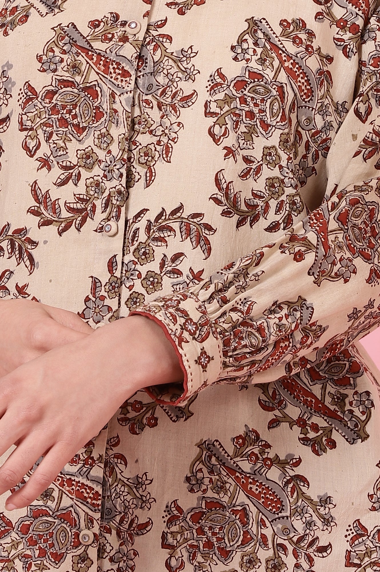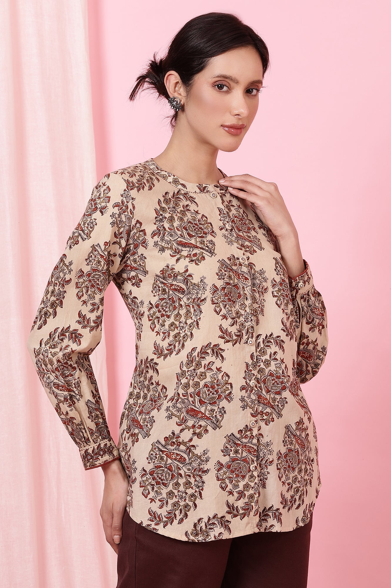 Add a touch of timeless elegance to your wardrobe with this Beige Kalamkari Block Print Top in comfortable cotton voile. Features delicate embroidery detail at the cuff.