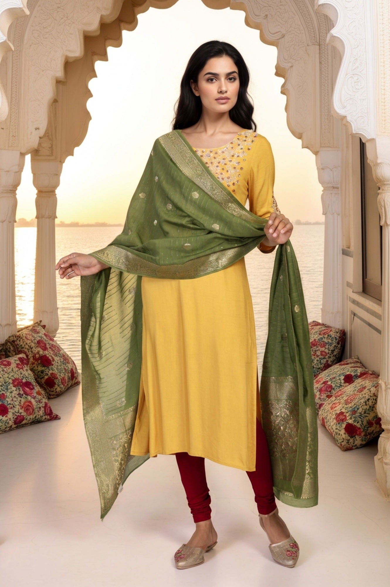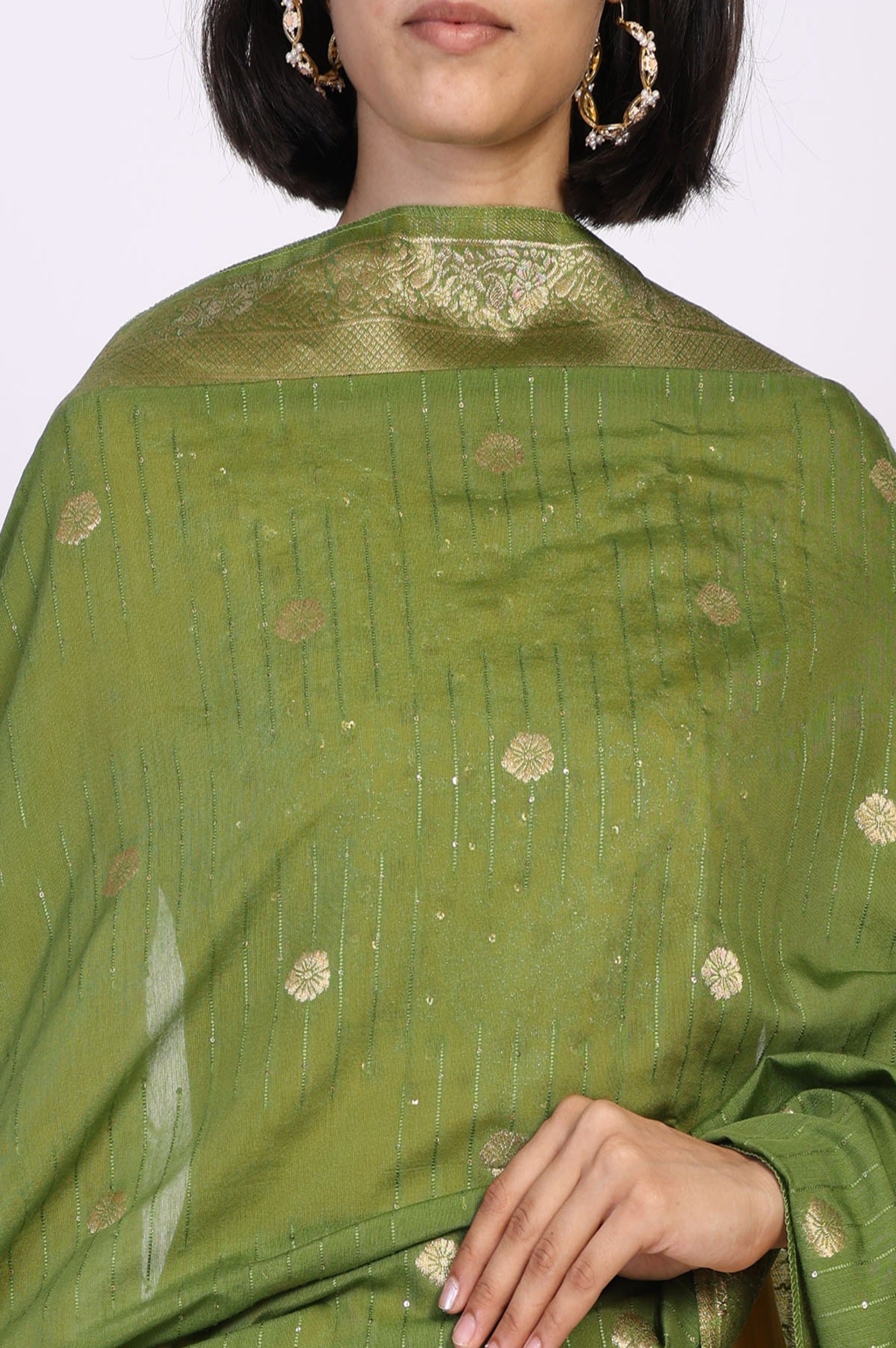 Woven with timeless grace, this ethnic dupatta for women is a masterpiece of traditional textile art. The rich Green canvas is brought to life with delicate, all-over floral buttis, meticulously crafted using a classic Jacquard weave. This designer dupatta is framed by a magnificent, wide border showcasing intricate Zari work that lends it a regal shimmer with every movement you make. Measuring a generous 2.25 meters long and 34 inches wide, this opaque stole drapes beautifully over your shoulders, its substantial yet surprisingly soft feel perfect for making a statement at grand occasions. You'll find it’s the ideal accessory to elevate your favorite kurtas and lehengas, making it perfect for weddings, festivals, and celebratory gatherings. Pair this stunning green jacquard dupatta with a contrasting outfit to let its artistry truly shine. As a versatile scarf-style wrap, it's a treasure you'll reach for season after season.
