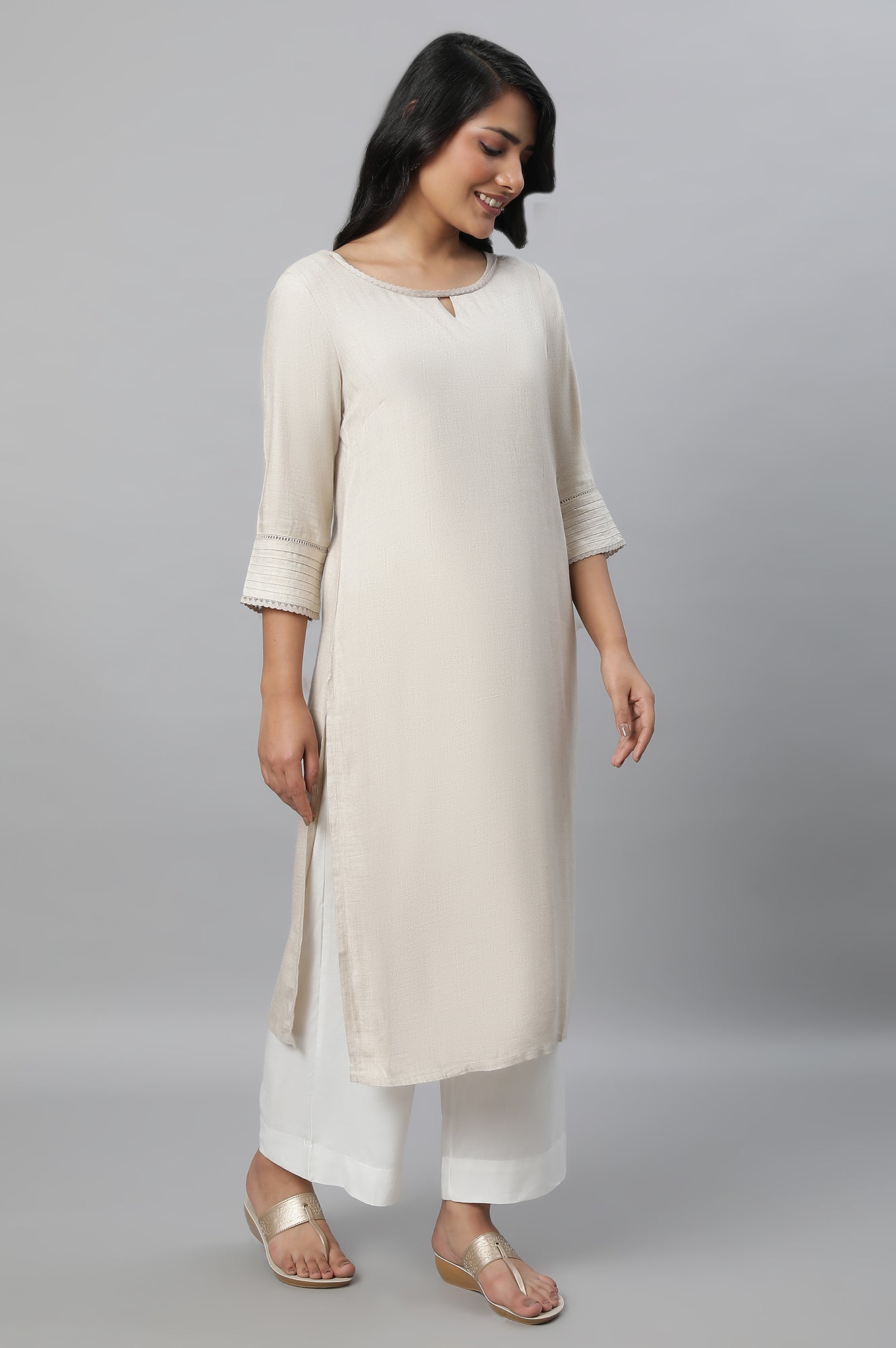 Crafted In Beautiful Melange Fabric, This Kurta Has A Unique Round Neckline With Lace Detail And V-Shaped Key Hole. The Sleeves Are Styled With Pintucks And Lace To Give The Garment A Feminine Touch. Must Have Garment For Any Casual Occasion. Available In Multiple Colors.
