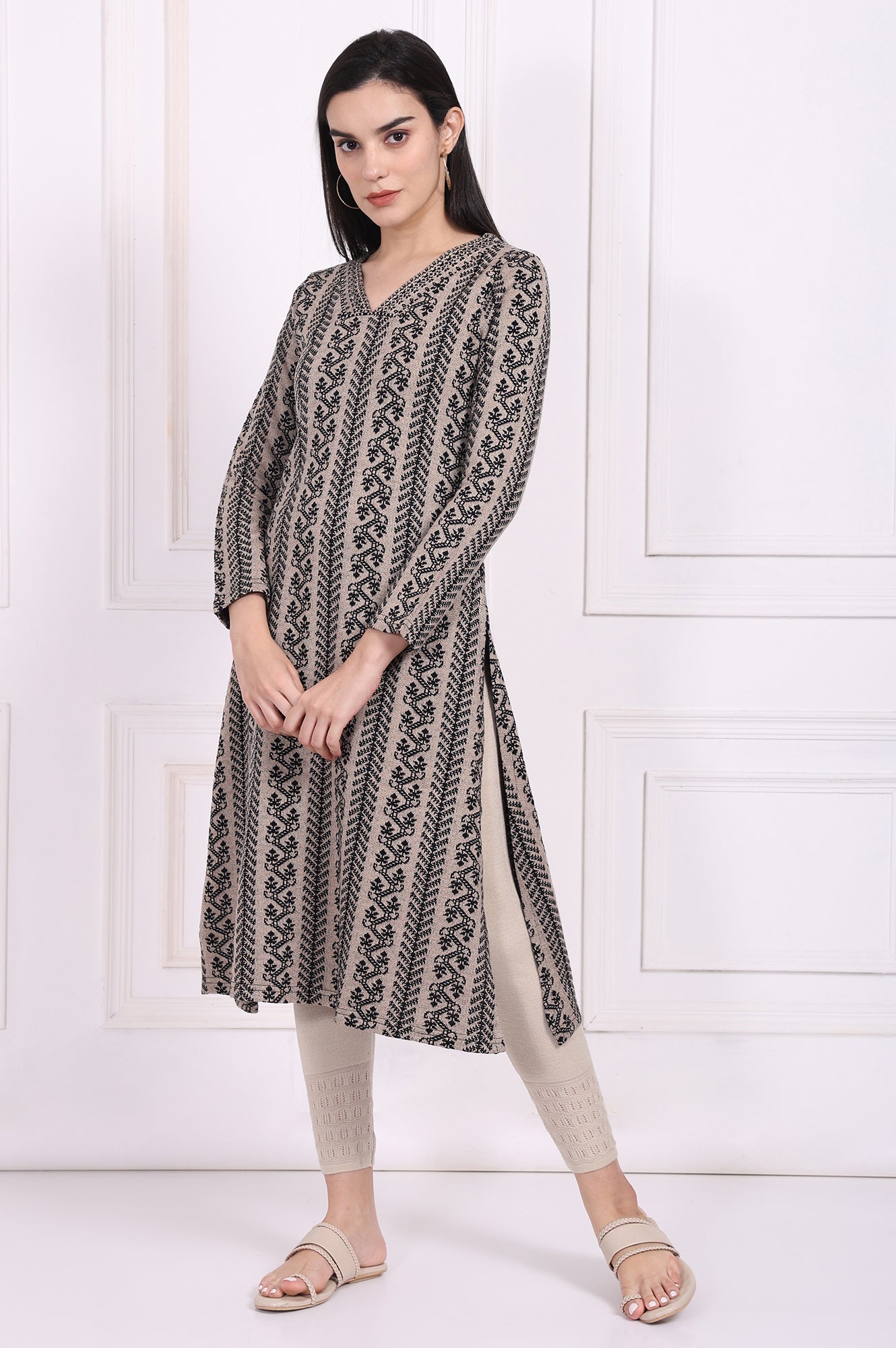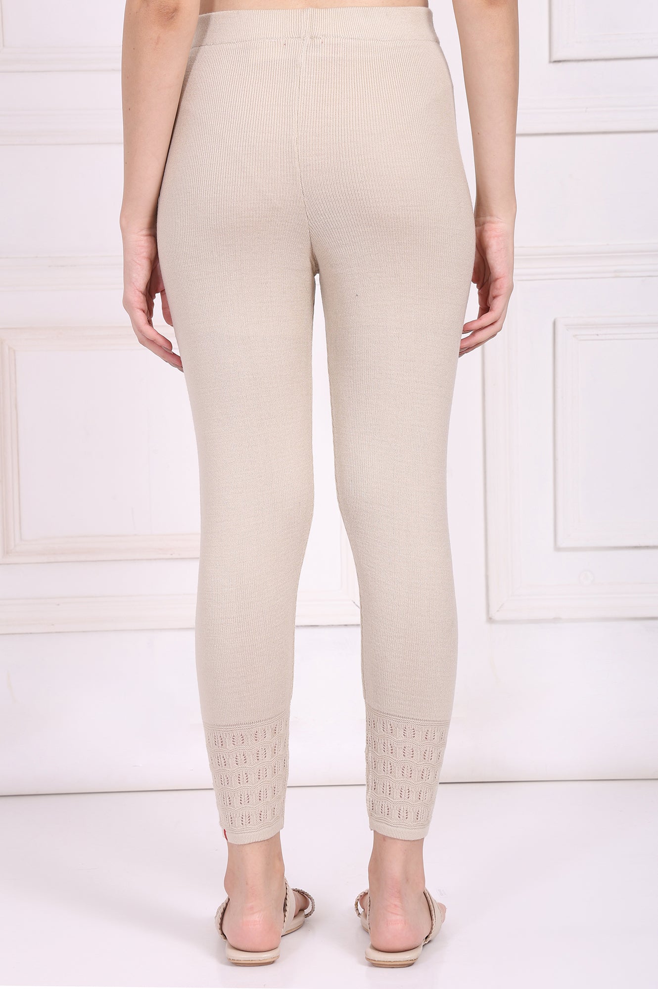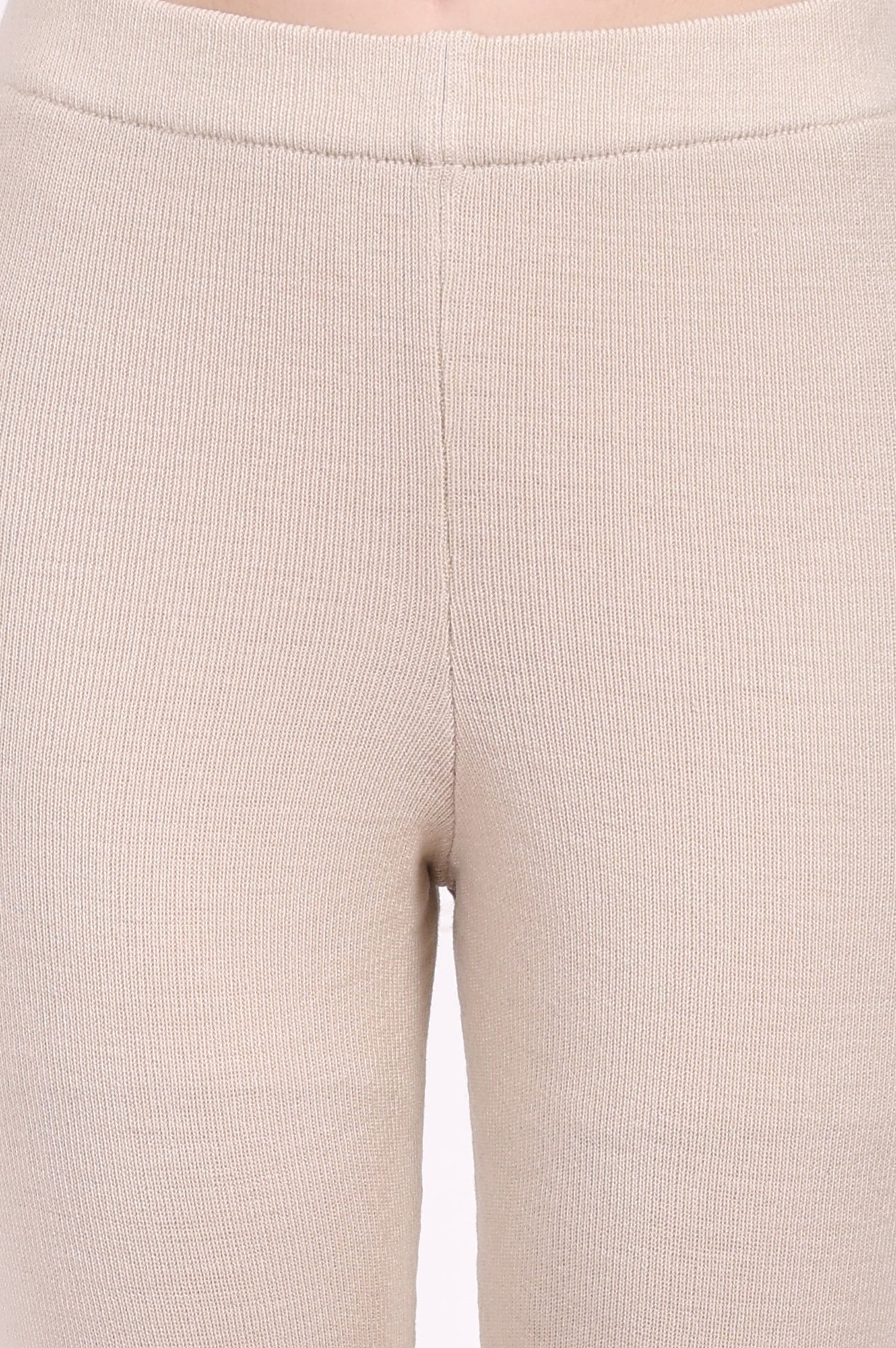 Softly textured elegance! These beige acrylic leggings for women are crafted for winter comfort and style. Featuring a mid-rise elasticated waistband, they offer a snug fit that moves with you. The textured hem design adds a touch of sophistication, making them perfect for pairing with ethnic kurtas or casual tops. Designed for versatility, these full-length leggings are ideal for festive gatherings or relaxed outings. The knit fabric ensures warmth and flexibility, while the solid beige color complements a variety of outfits. A must-have addition to your winter wardrobe, these leggings promise both style and comfort. Word count: 200