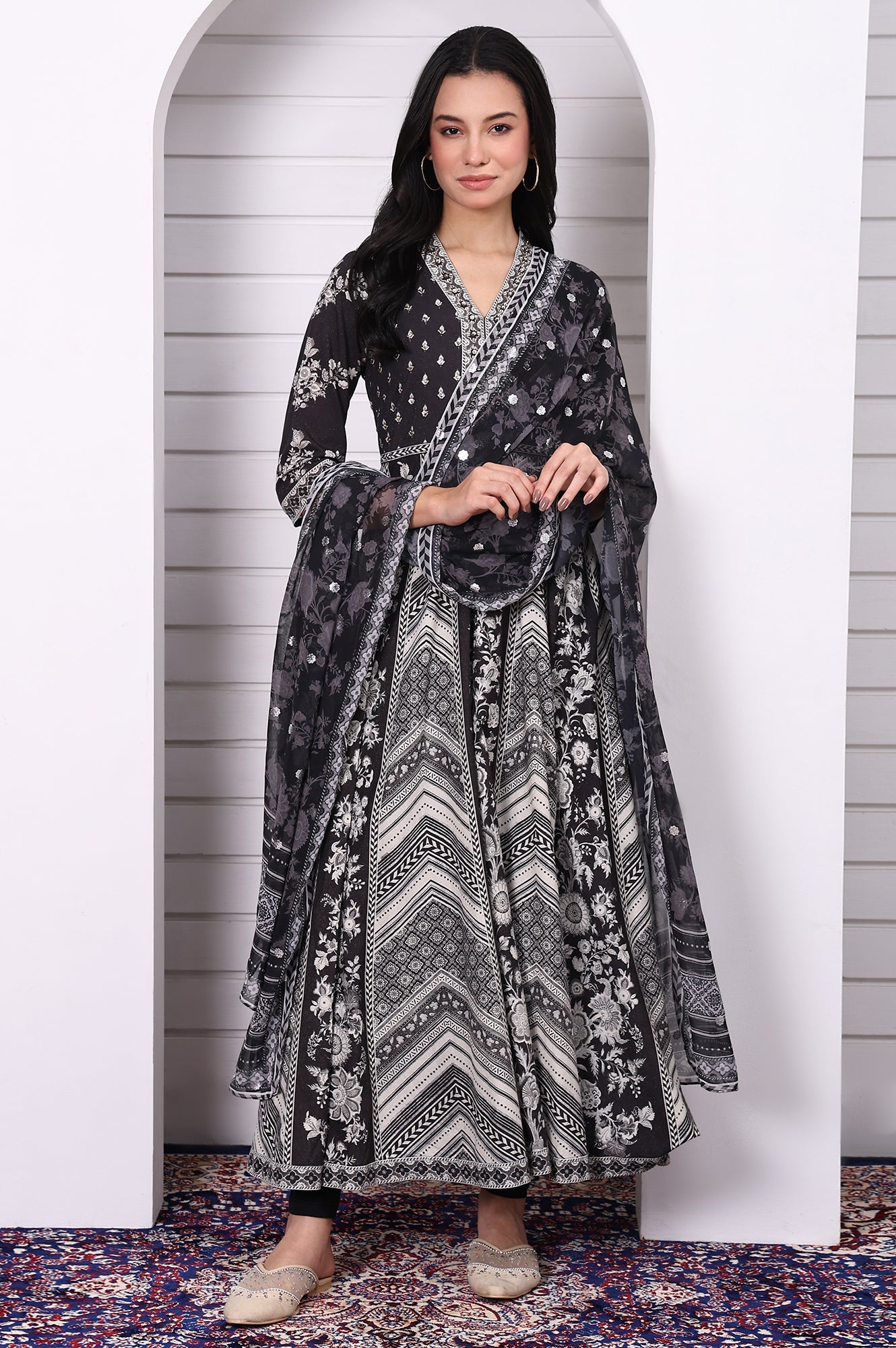 This black flared kurta set features hand work detailing and abstract prints that bring edge to festive styling. The flowy silhouette pairs with sleek leggings and a matching dupatta, offering a bold option for celebrations or evening gatherings.