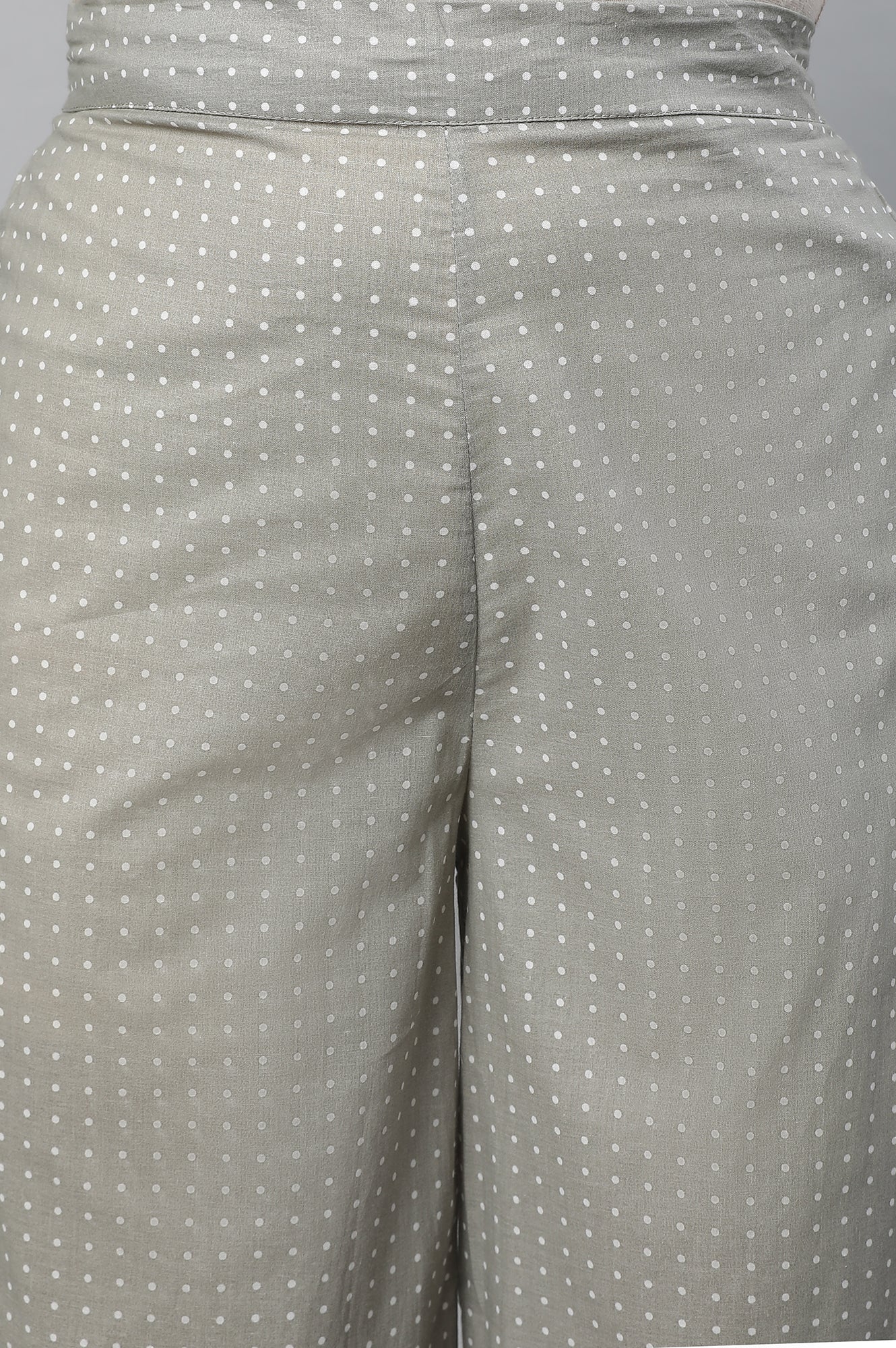 Black embroidered kurta in straight silhouette has short sleeves and round neck. It is paired with grey polka dot palazzos pants.