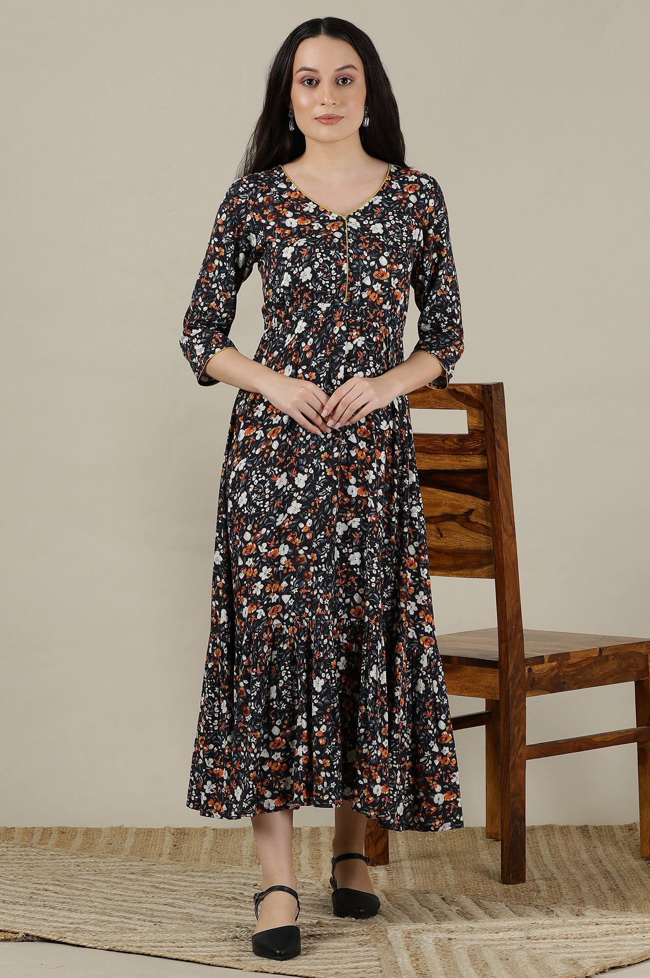 Black Floral Printed Flared Flowy Rayon Dress with Yellow Piping