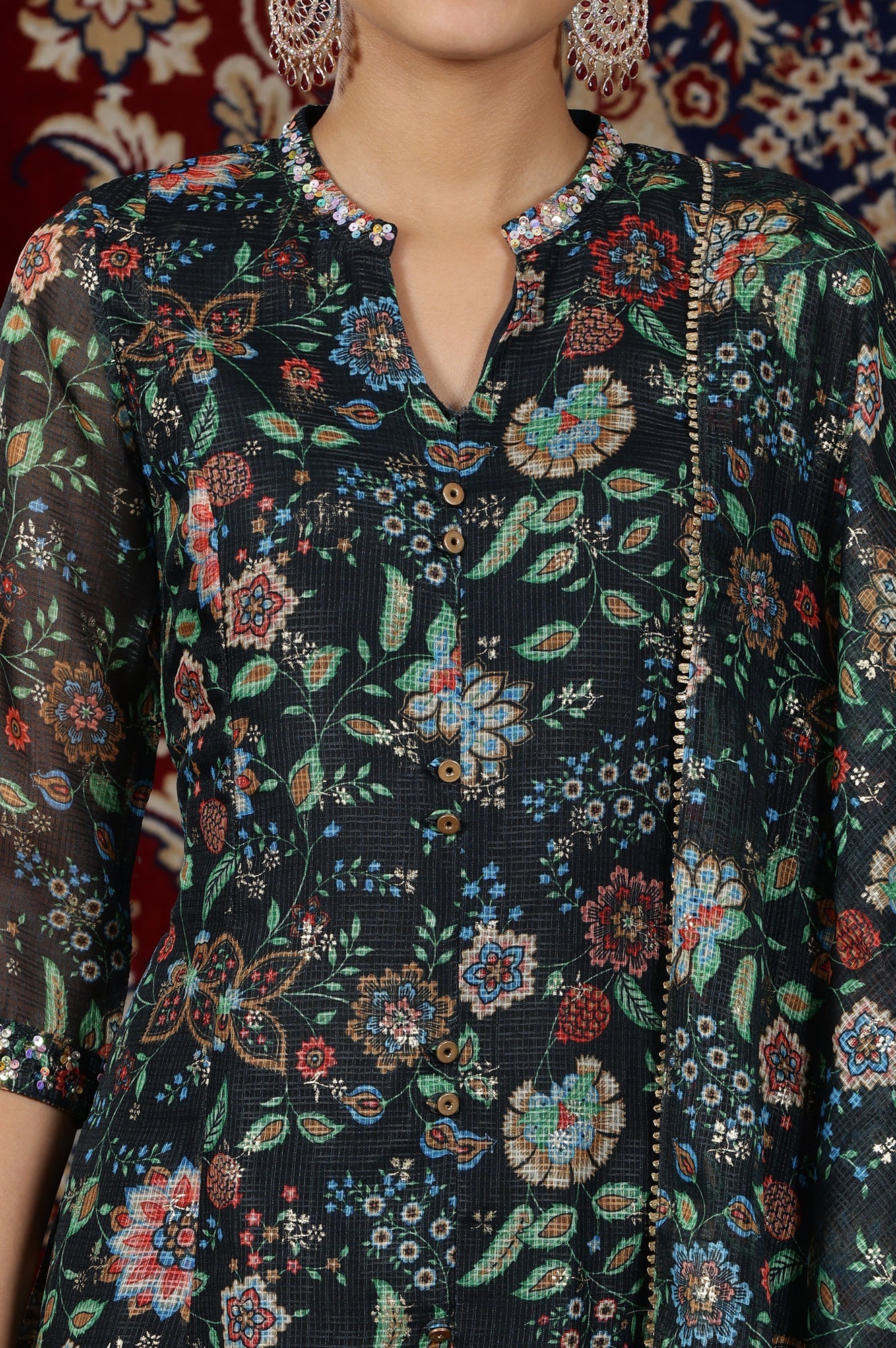 Black Floral Printed Kota Panelled Kurta, Pants and Dupatta Set