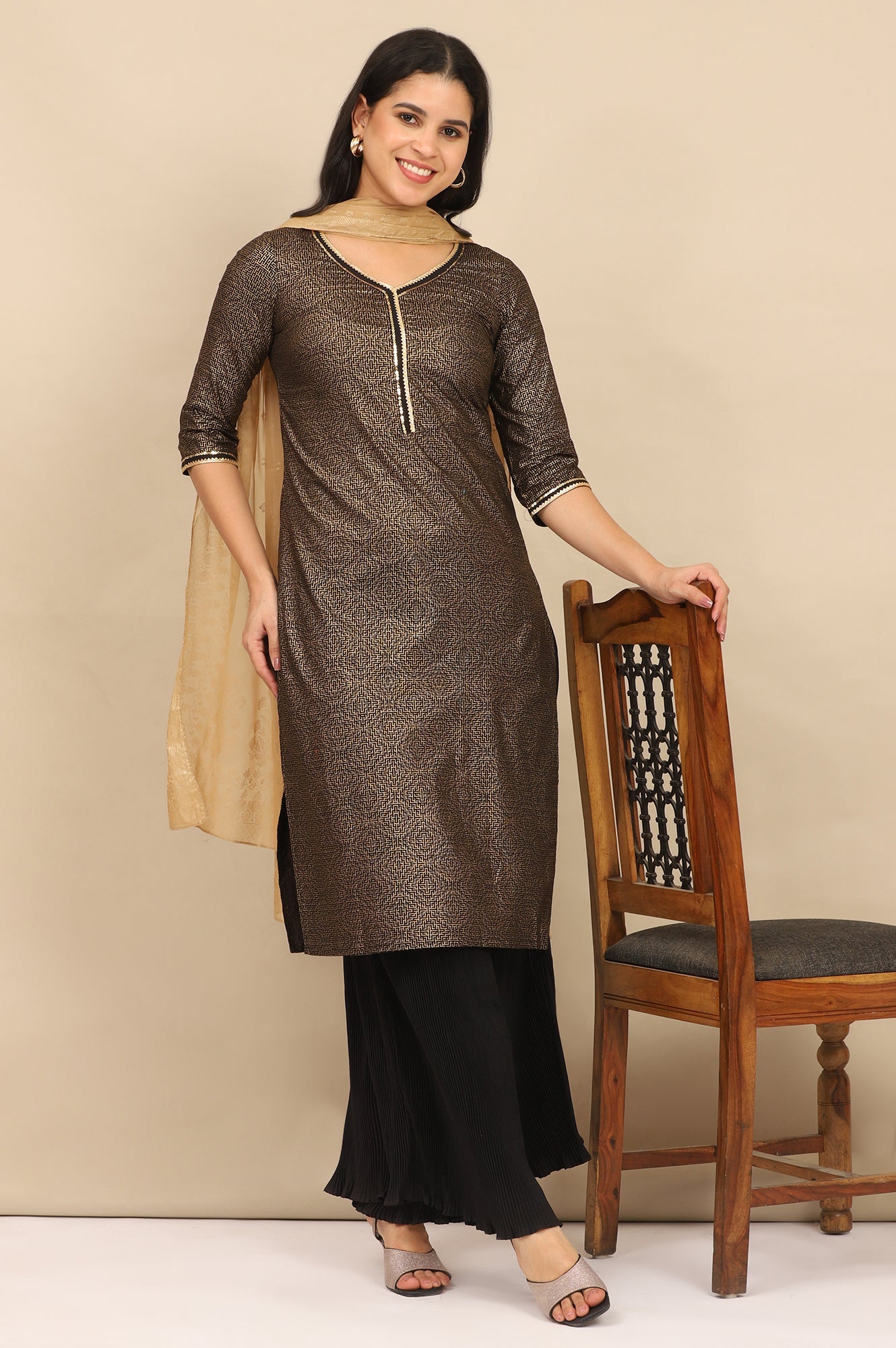 Black Foil Printed Embellished Straight Kurta, Pleated Palazzo and Dupatta Set