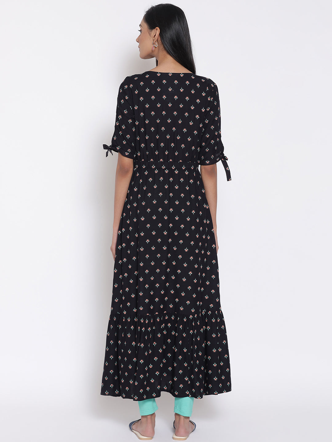 Catch All Eye-Balls On You With This Chic & Flared Set. The Set Has Black Khadi Print Dress In V-Neck And Tie-Up On Sleeves. It Is Paired With Skin Fit Tights.