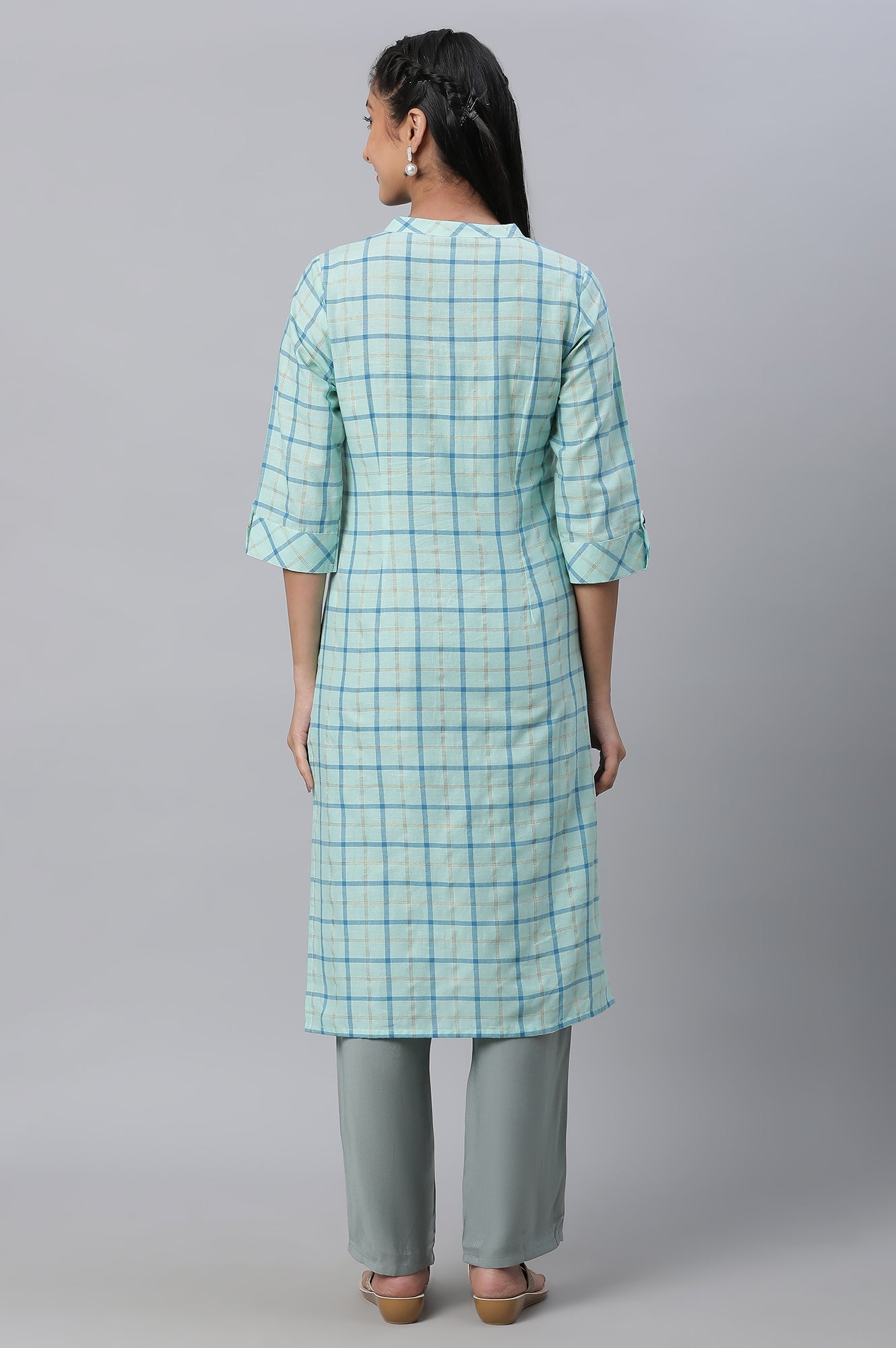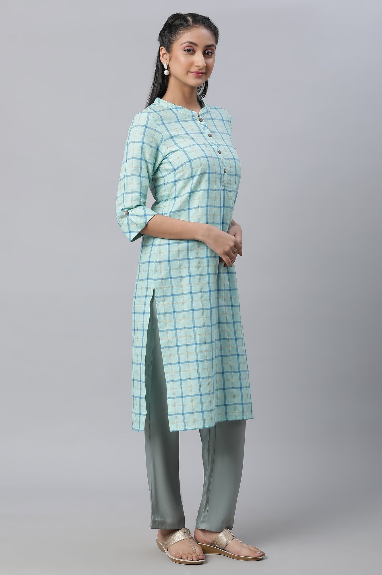 A Classic Checkered kurta With A Smart Cut And Trims. This kurta Is A Wardrobe Essential For Any Season And For Any Time Of The Day. It Has Band Collar With Hald Placket.